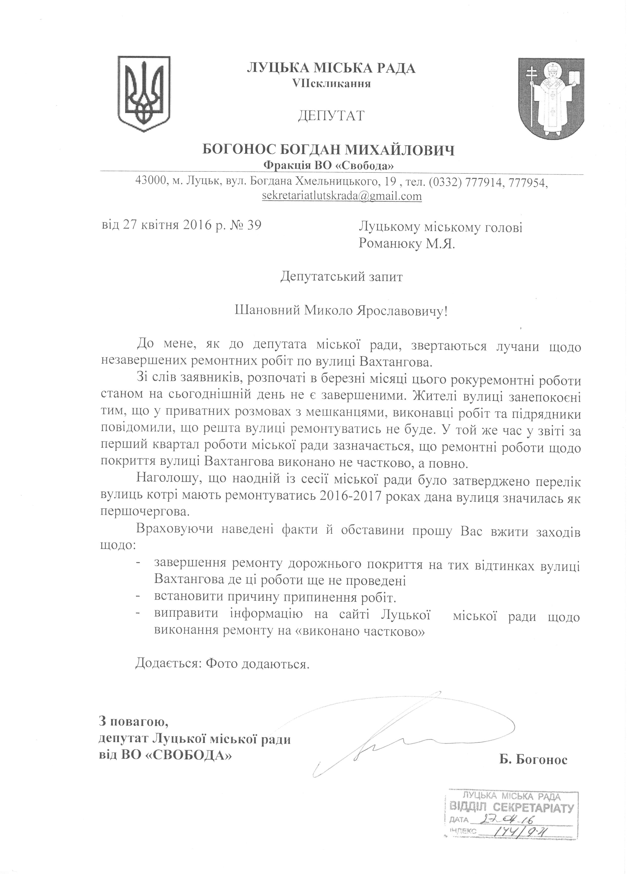 Про запит депутата міської ради Богоноса Б.М. щодо завершення ремонту дорожнього покриття на вул. Вахтангова