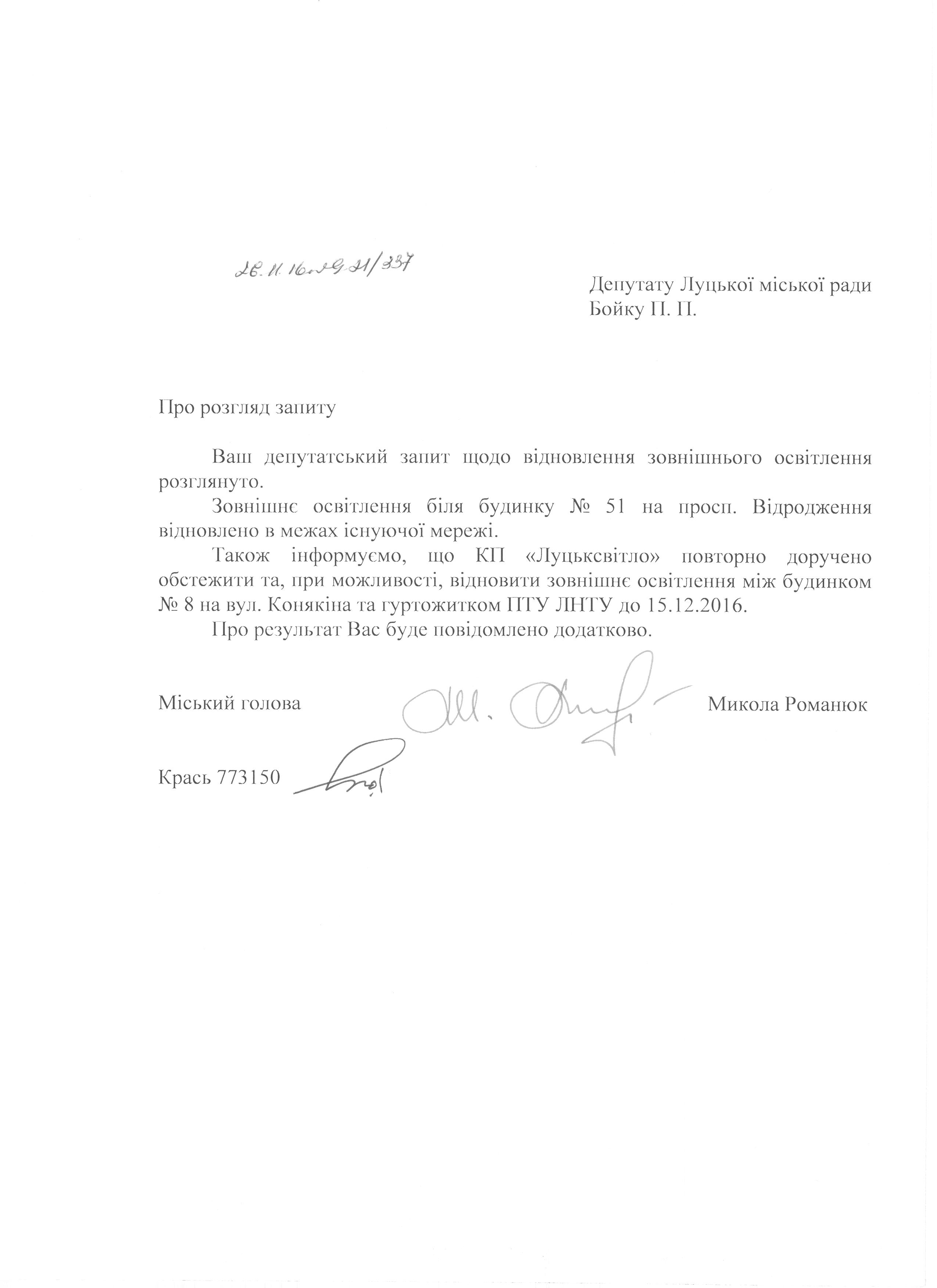 1. Підтримати запит депутата міської ради Бойка П.П. до міського голови Романюка М.Я. щодо відновлення освітлення на пр. Відродження, 51 та вул. Конякіна, 8 (додається).