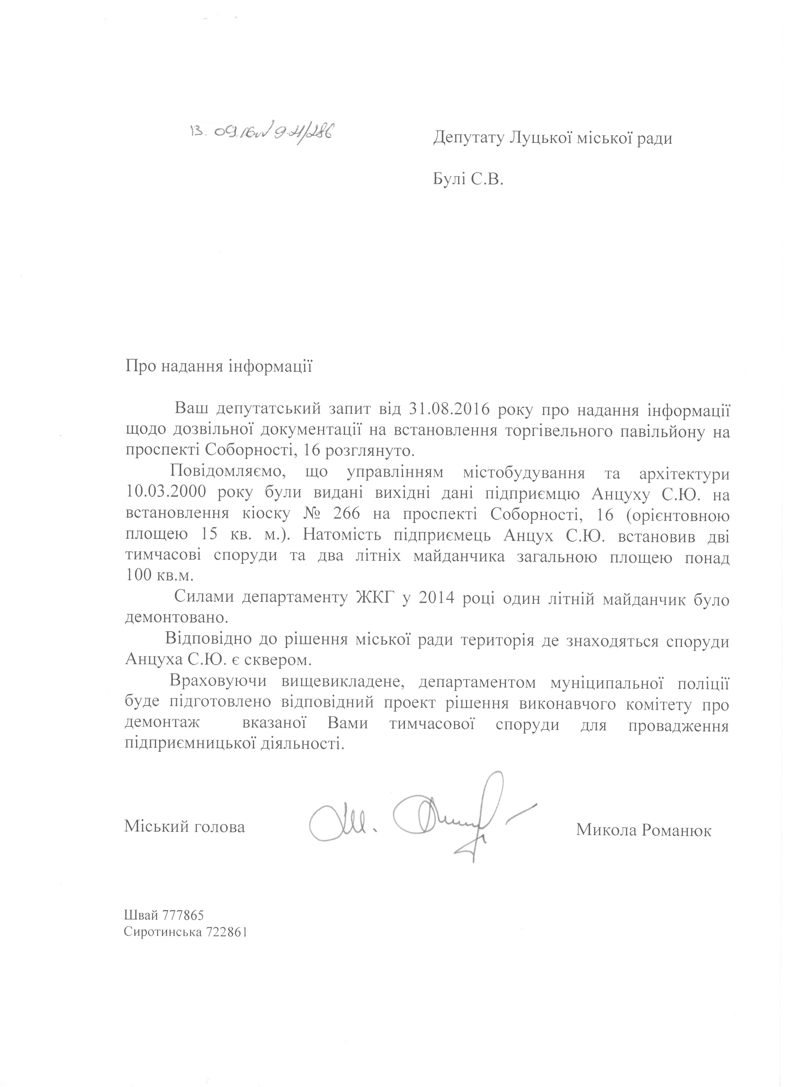 Про запит депутата міської ради Були С.В. щодо перевірки встановлення павільйону на пр. Соборності, 16