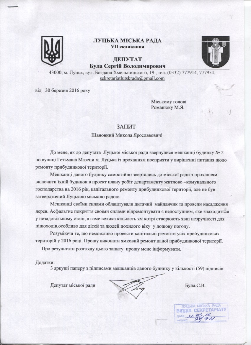 1. Підтримати запит депутата міської ради Були С.В. до міського голови Романюка М.Я. щодо ремонту прибудинкової території на вул. Гетьмана Мазепи (додається).