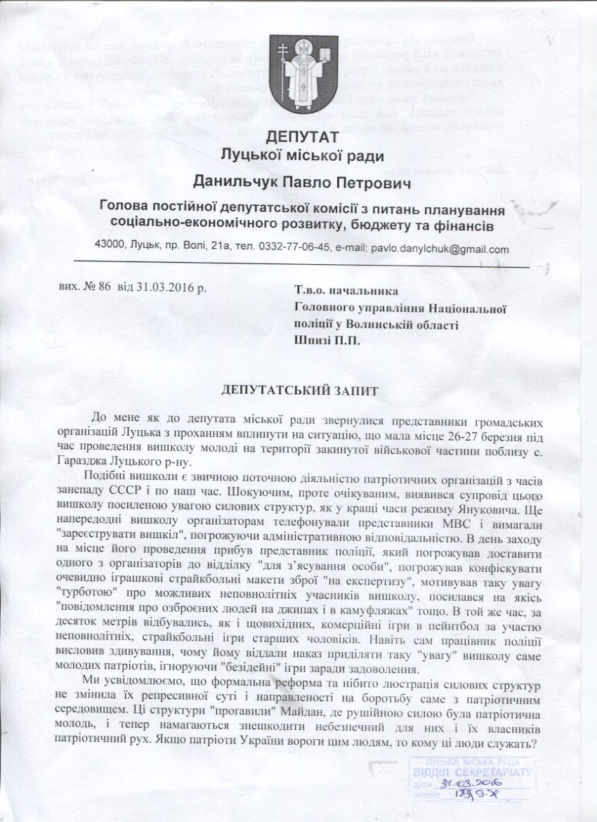 Про запит депутата міської ради Данильчука П.П. щодо припинення тиску правоохоронними органами на патріотичні організації