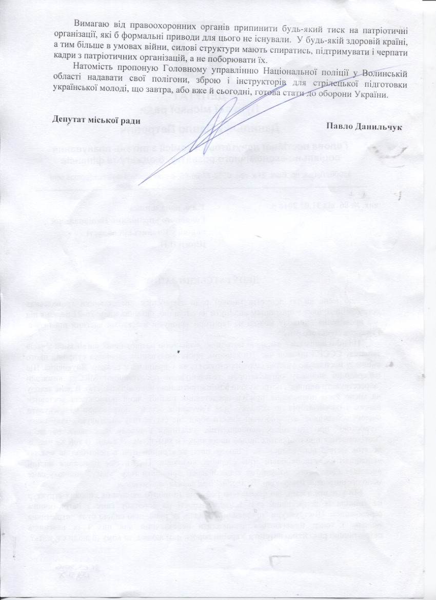 1. Підтримати запит депутата міської ради Данильчука П.П. до начальника Головного управління Національної поліції у Волинській області Шпиги П.П. щодо припинення тиску правоохоронними органами на патріотичні організації (додається).