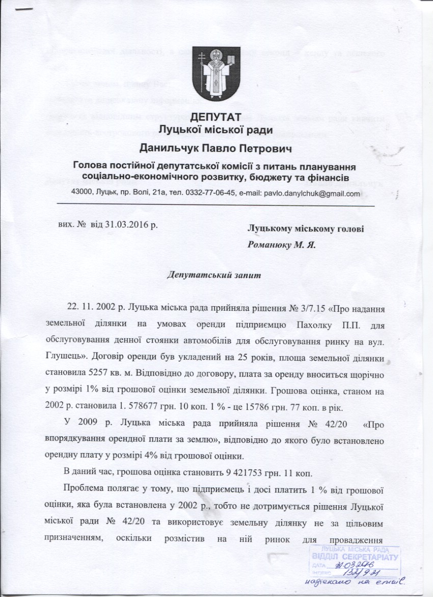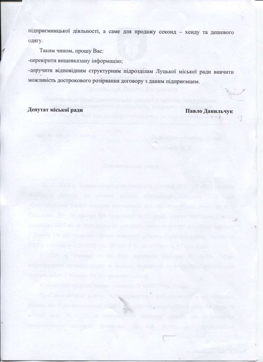 1. Підтримати запит депутата міської ради Данильчука П.П. до міського голови Романюка М.Я. щодо вивчення можливості дострокового припинення договору оренди з підприємцем Пахолко П.П. (додається).