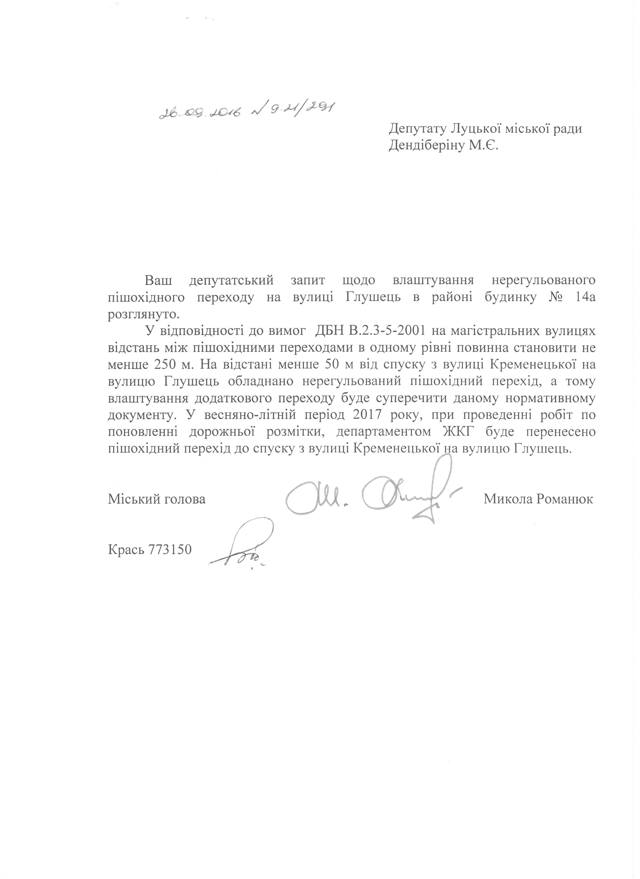 1. Підтримати запит депутата міської ради Дендіберіна М.Є. до міського голови Романюка М.Я. щодо облаштування пішохідного переходу на вул. Глушець, біля спуску з вул. Кременецької (додається).