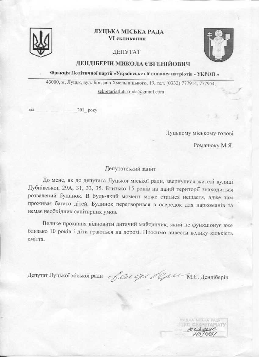 1. Підтримати запит депутата міської ради Дендіберіна М.Є. до міського голови Романюка М.Я. щодо відновлення дитячого маданчику на вул.Дубнівській (додається).