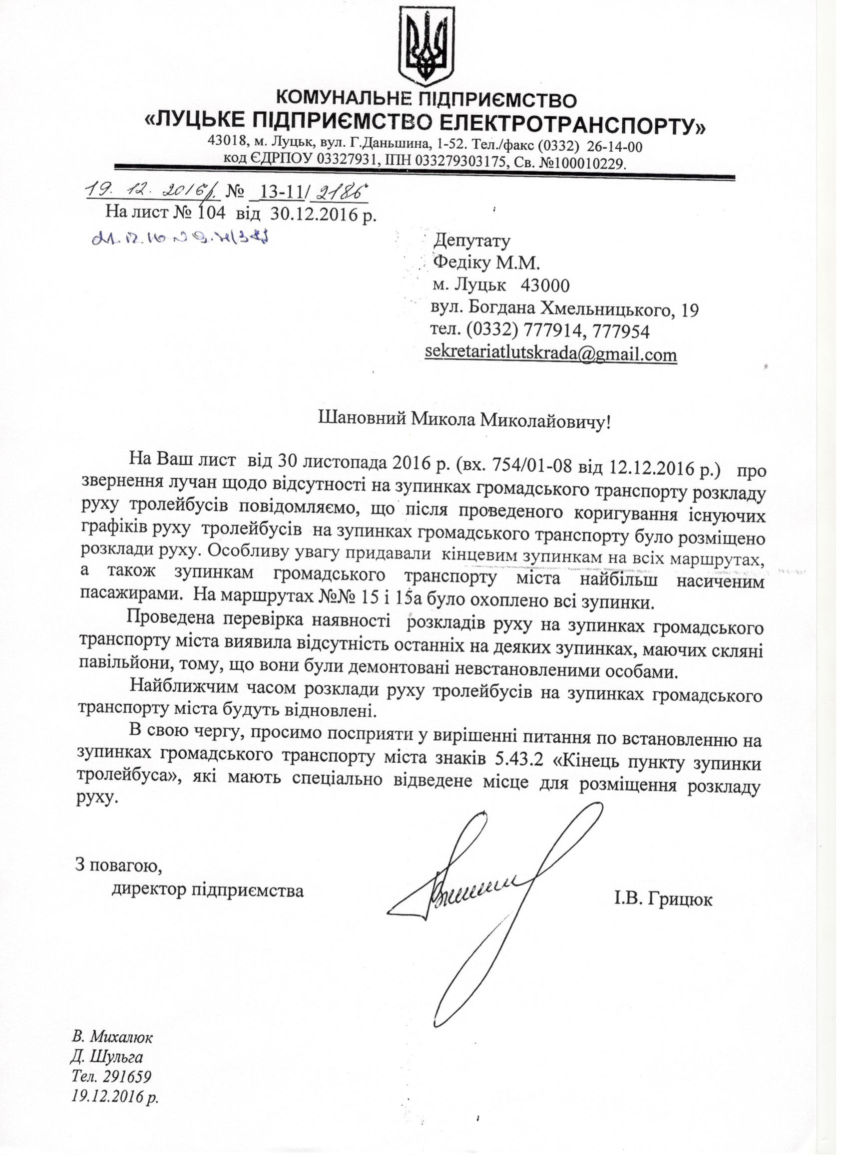 1. Підтримати запит депутата міської ради Федіка М.М. до директора Луцького підприємства електротранспорту Грицюка І.В. щодо розміщення на зупинках громадського транспорту графіків руху тролейбусів (додається).