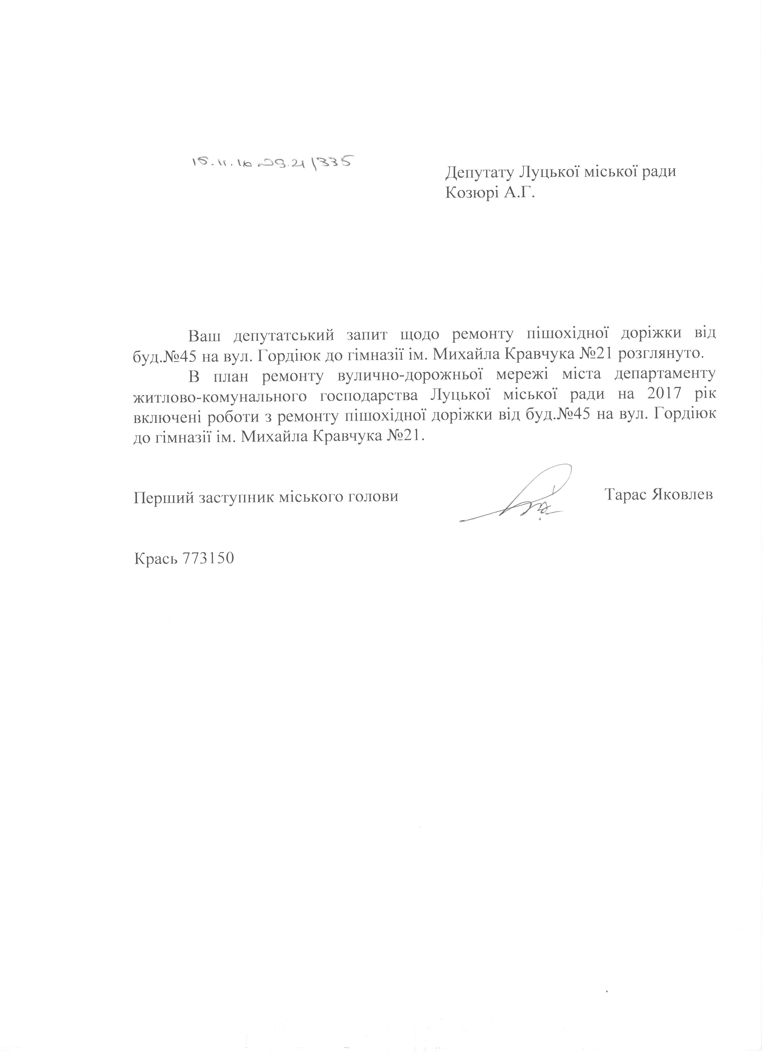 Про запит депутата міської ради Козюри А.Г. щодо влаштування пішохідної доріжки між будинками на вул. Гордіюк, 37, 39, 41, 45, вул. Кравчука, 2, 4 та гімназією ім. Михайла Кравчука № 21