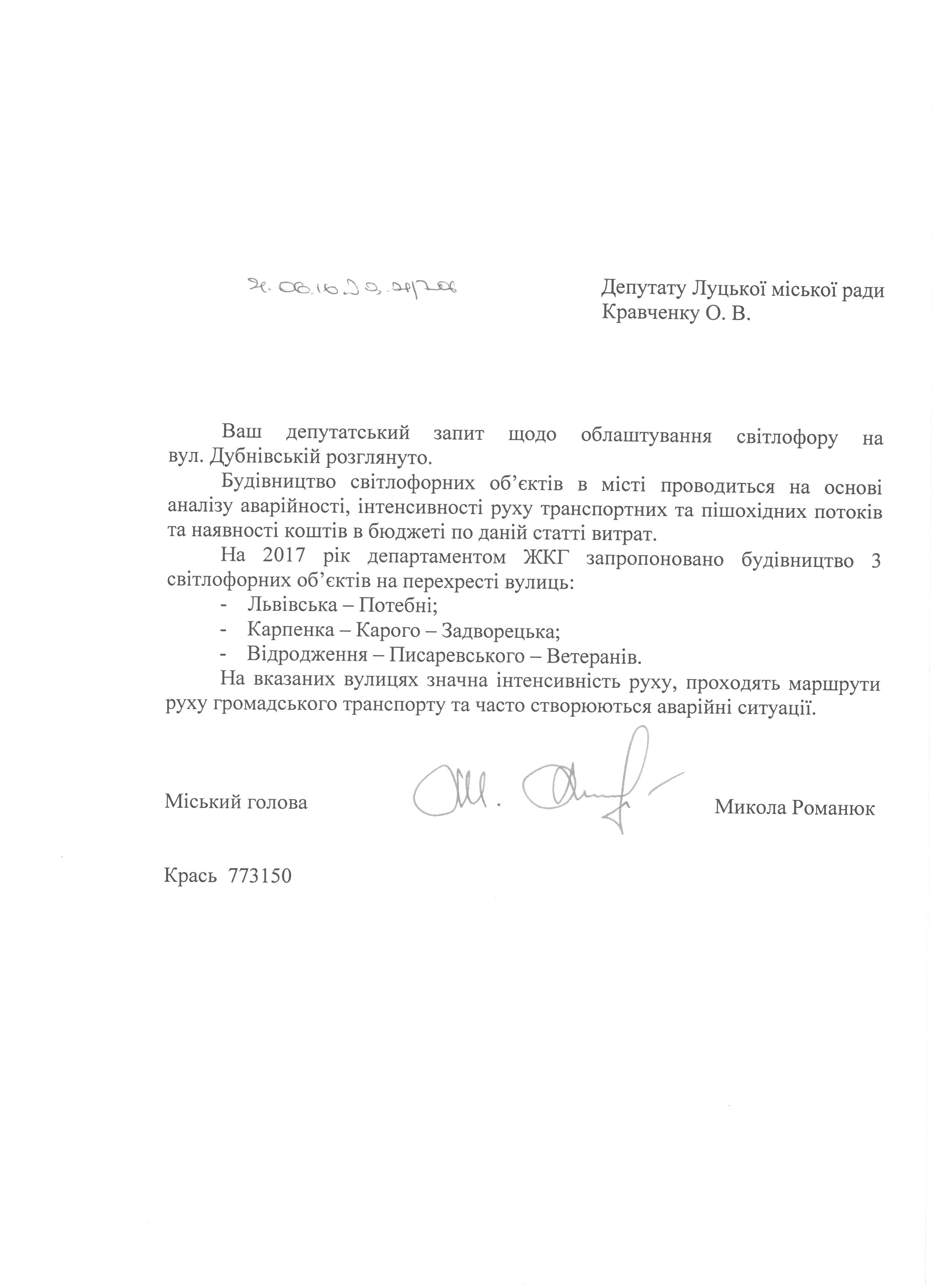 Про запит депутата міської ради Кравченка О.В. щодо влаштування світлофору на вул. Дубнівській