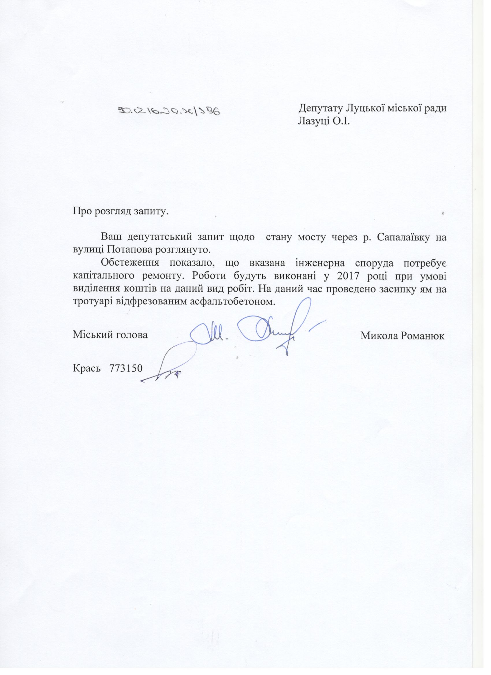 1. Підтримати запит депутата міської ради Лазуки О.І. до міського голови Романюка М.Я. щодо перевірки стану мосту через р. Сапаліївка на вул. Потапова (додається).