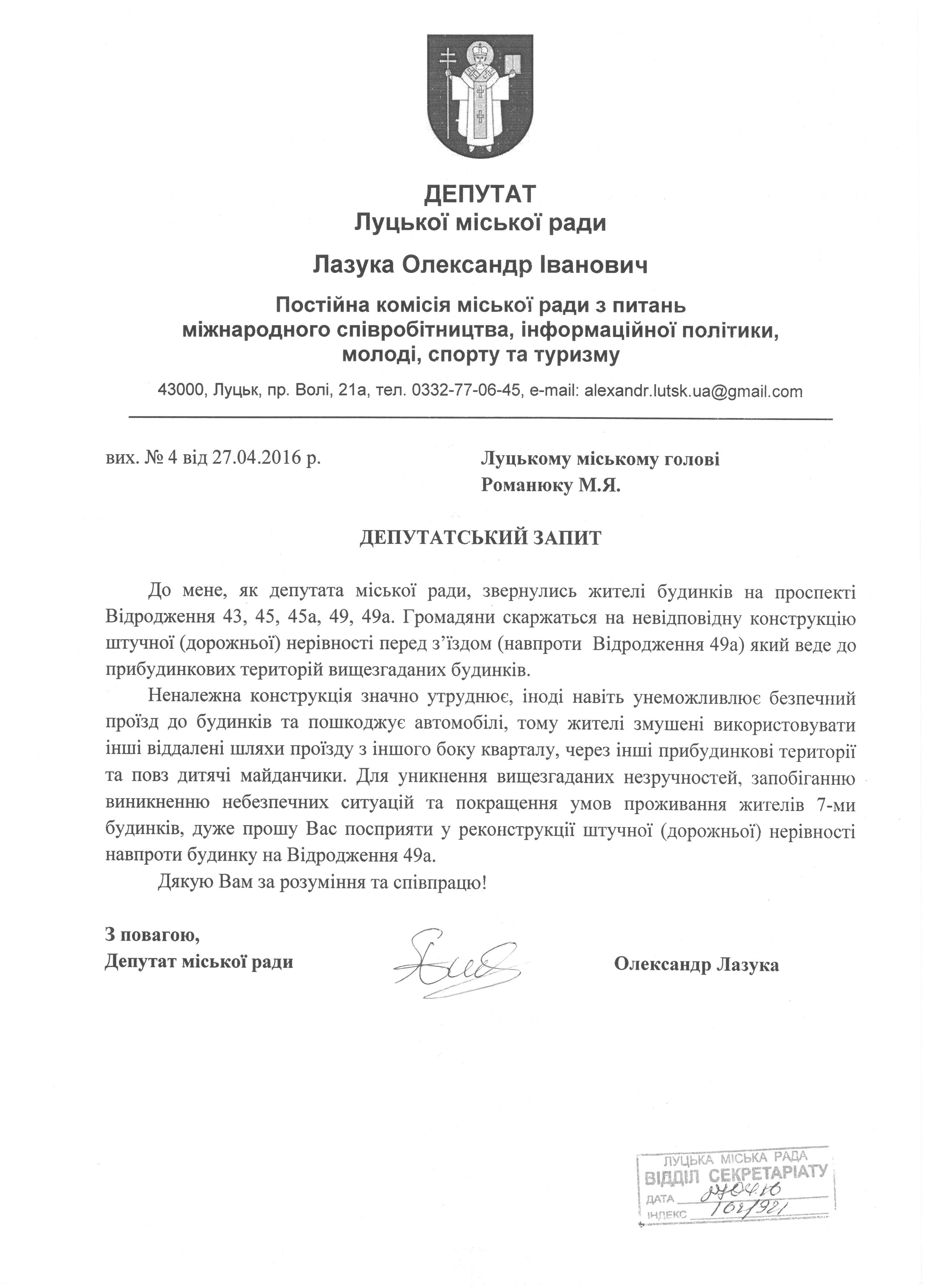 Про запит депутата міської ради Лазуки О.І. щодо реконструкції обмежувача швидкості руху на в’їзді до будинків на пр. Відродження, 43, 45, 45а, 49, 49а