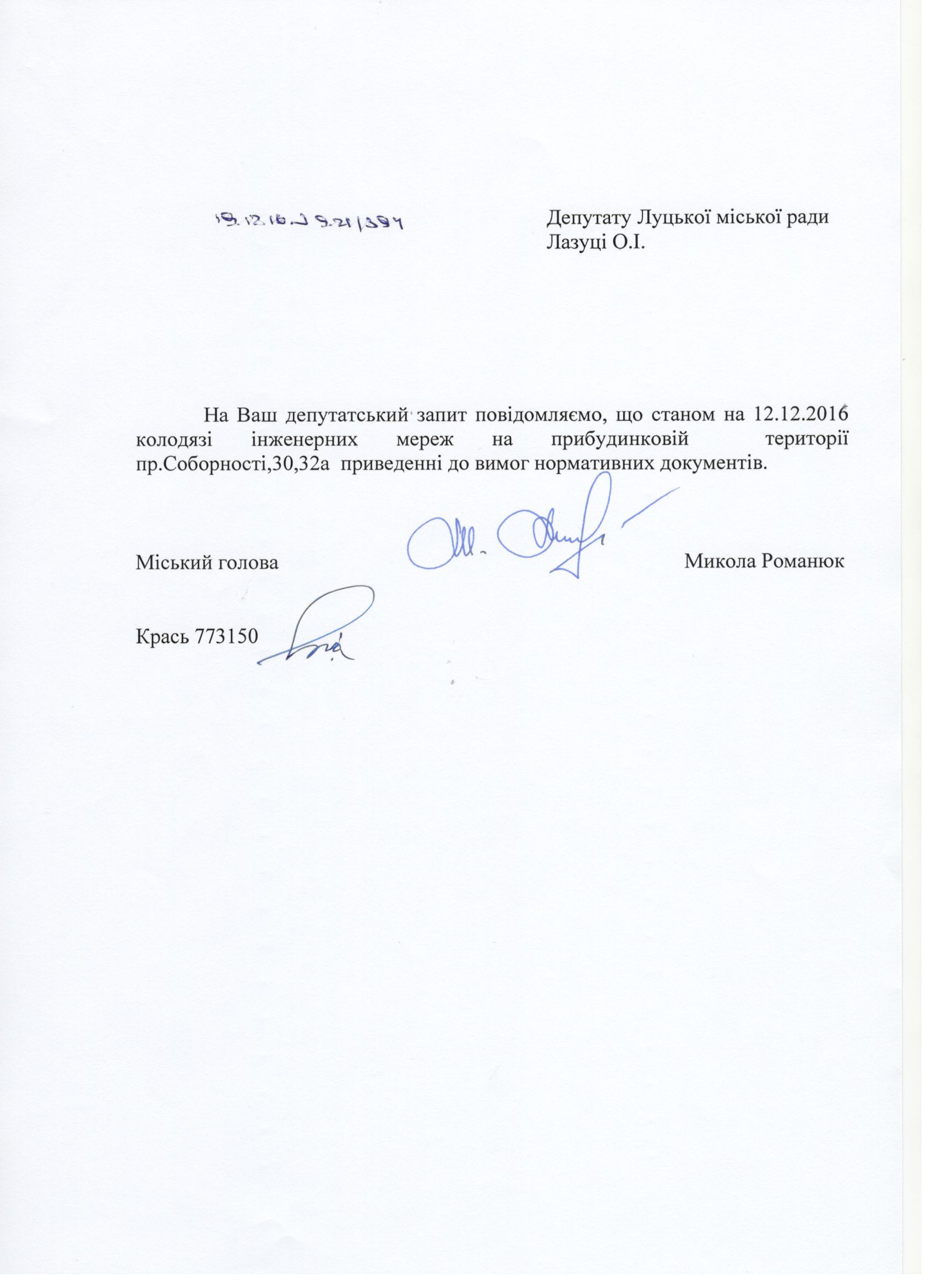 1. Підтримати запит депутата міської ради Лазуки О.І. до міського голови Романюка М.Я. щодо заміни каналізаційного люка на пр. Соборності, 30 (додається).