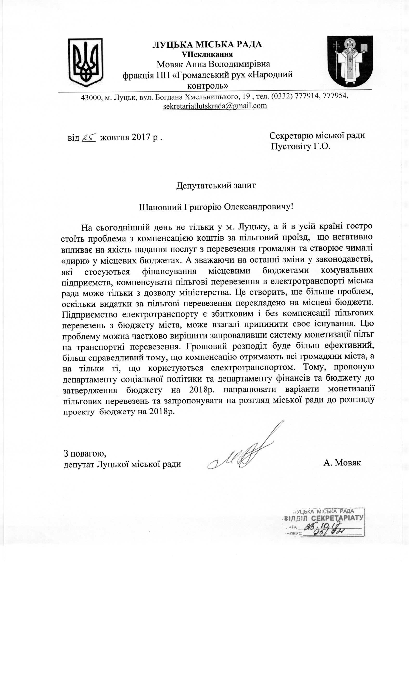 1. Підтримати запит депутата міської ради Мовяк А.В. до секретаря міської ради Пустовіта Г.О. щодо монетизації пільгових перевезень (додається).