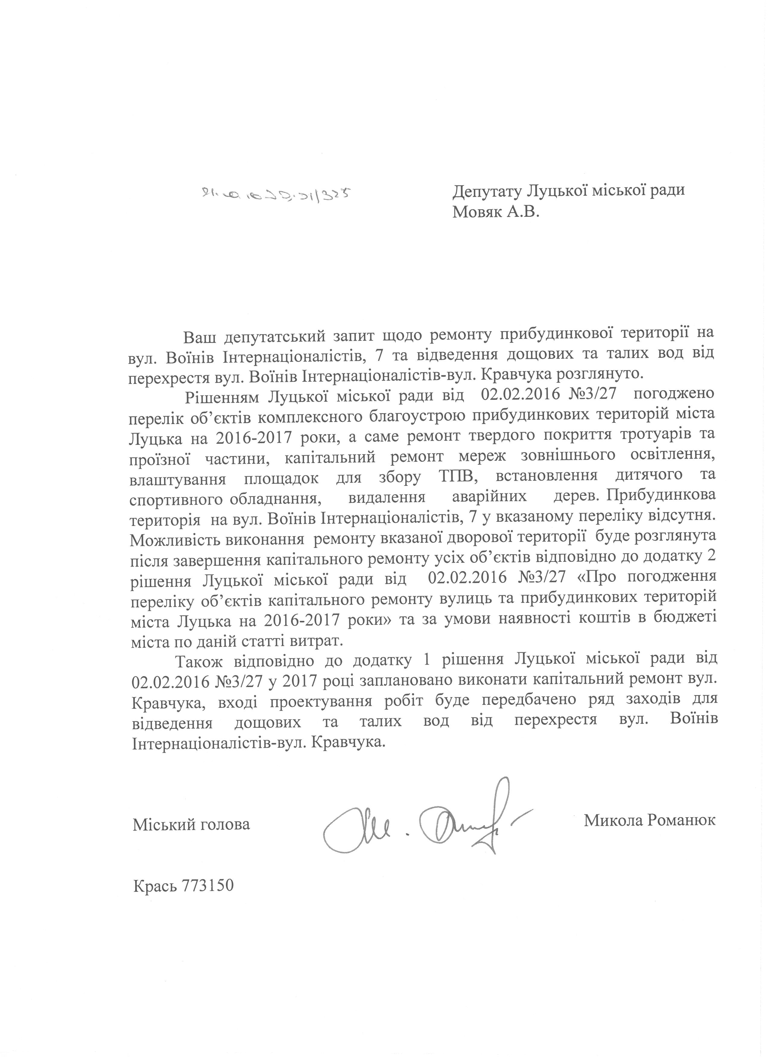 1. Підтримати запит депутата міської ради Мовяк А.В. до міського голови Романюка М.Я. щодо ремонту прибудинкової території на вул. Воїнів-Інтернаціоналістів, 7 (додається).