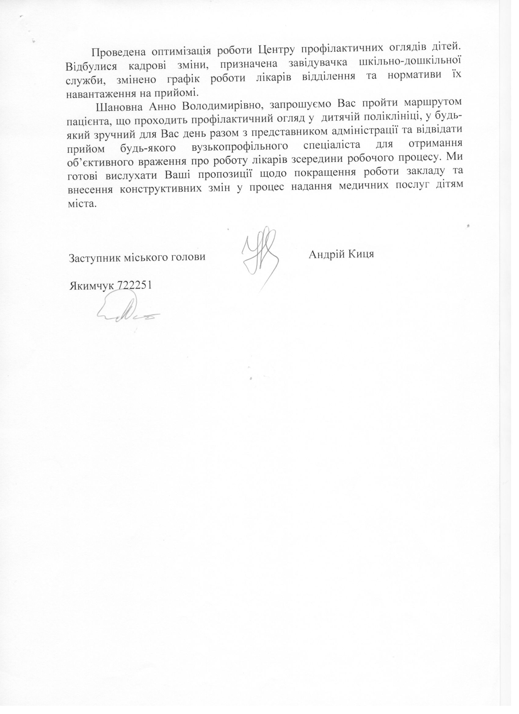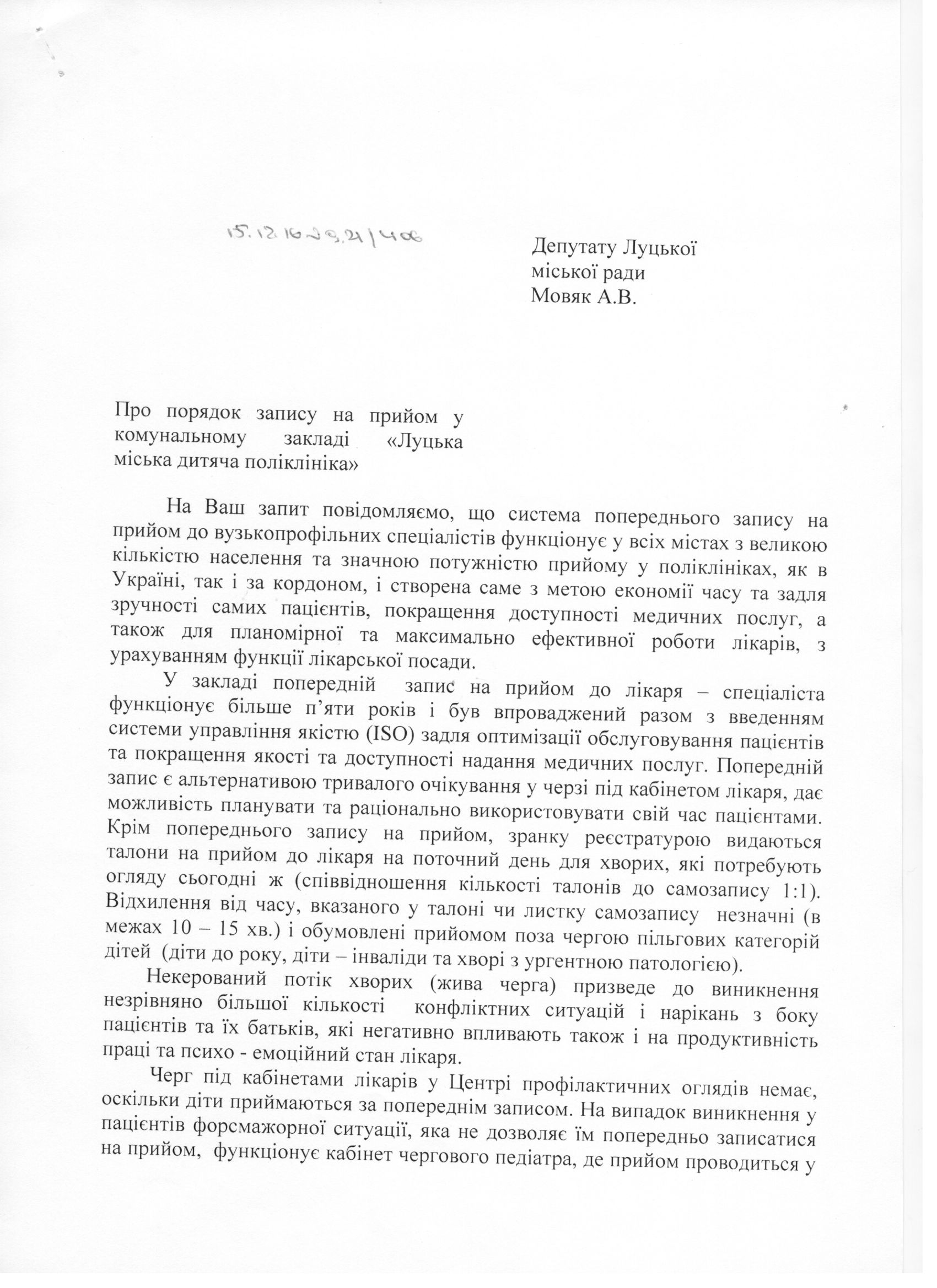 Про запит депутата міської ради Мовяк А.В. щодо впорядкування системи записів до лікаря в дитячих поліклініках