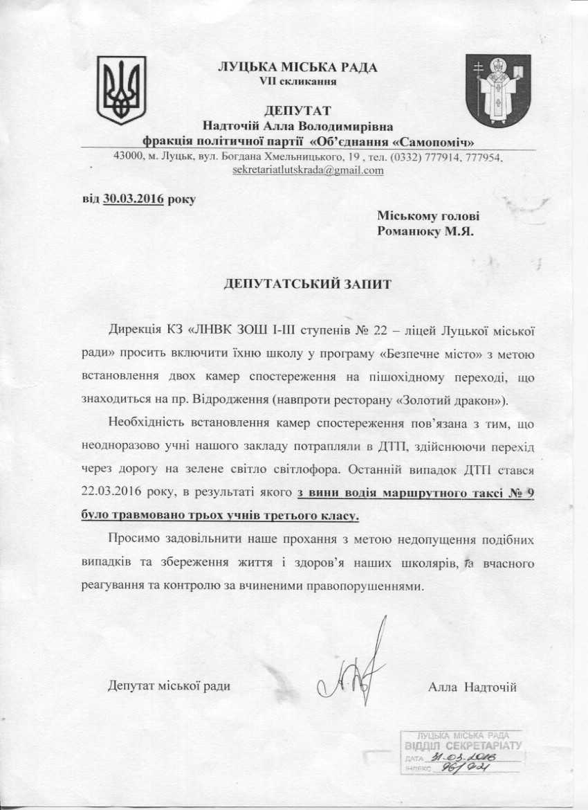 1. Підтримати запит депутата міської ради Надточій А.В. до міського голови Романюка М.Я. щодо включення КЗ “Луцький навчально-виховний комплекс “ЗОШ I-III ступенів №22 -ліцей Луцької міської ради” до Програми “Безпечне місто”(додається).