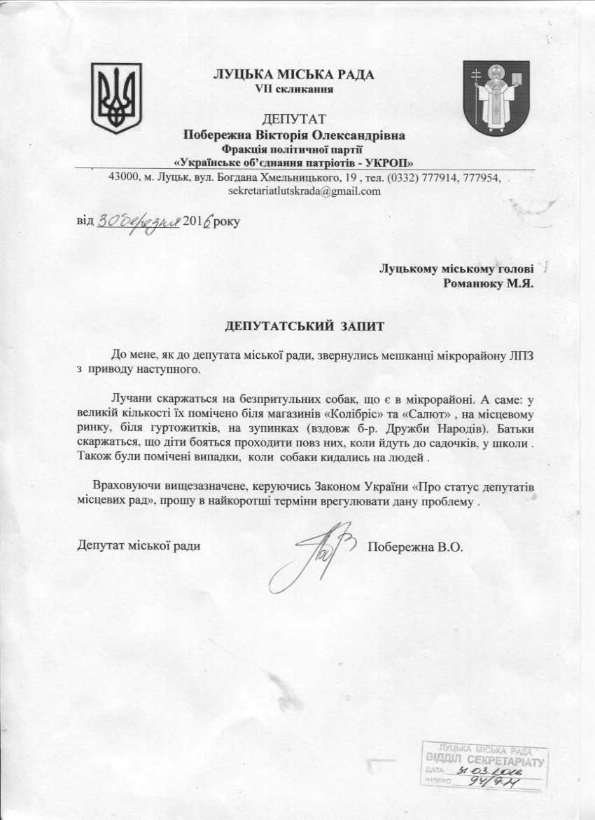 Про запит депутата міської ради Побережної В.О. щодо проблеми безпритульних собак на бульварі Дружби Народів