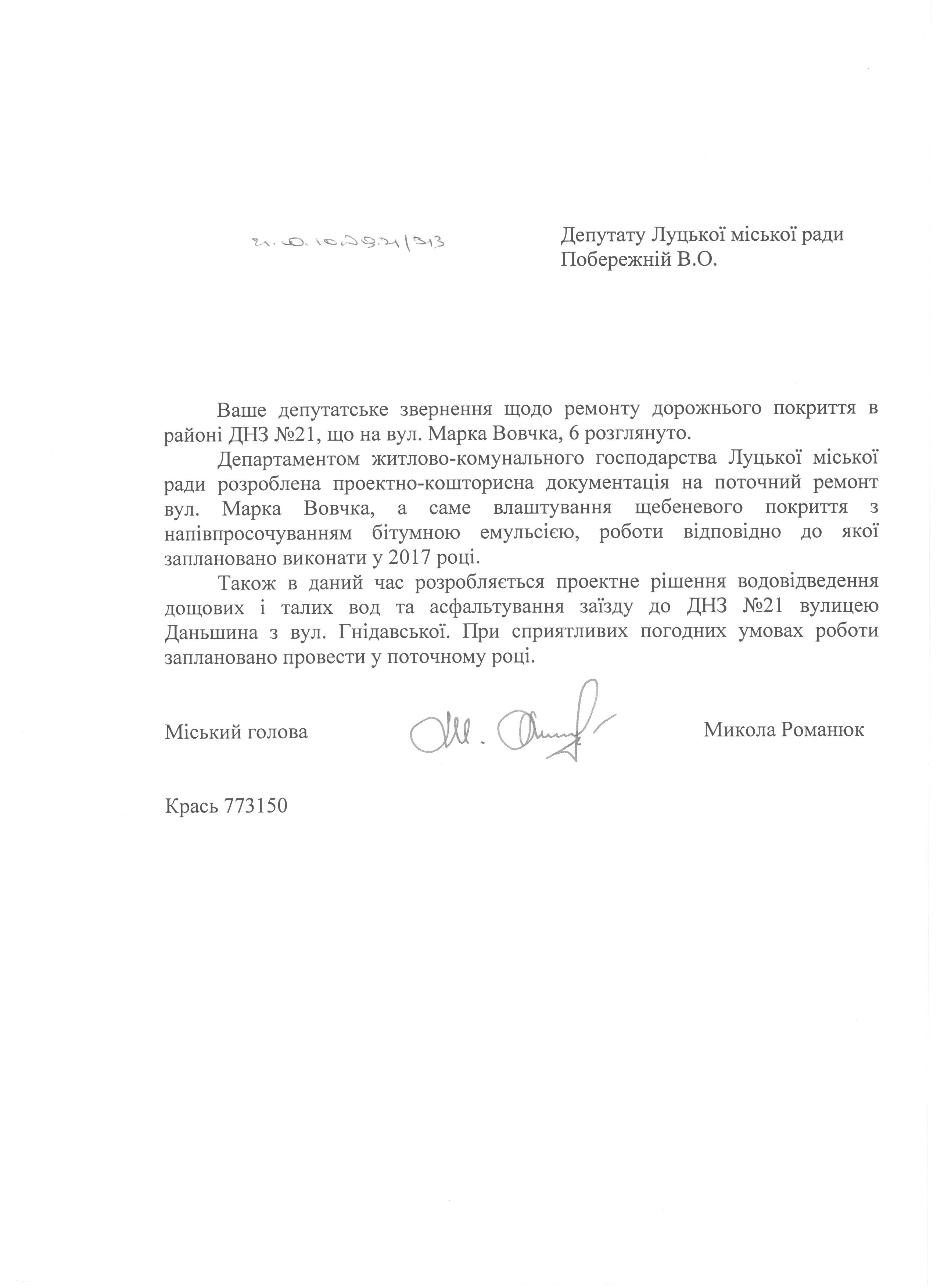 Про запит депутата міської ради Побережної В.О. щодо ремонту дороги до ДНЗ № 21 на вул. Марка Вовчка