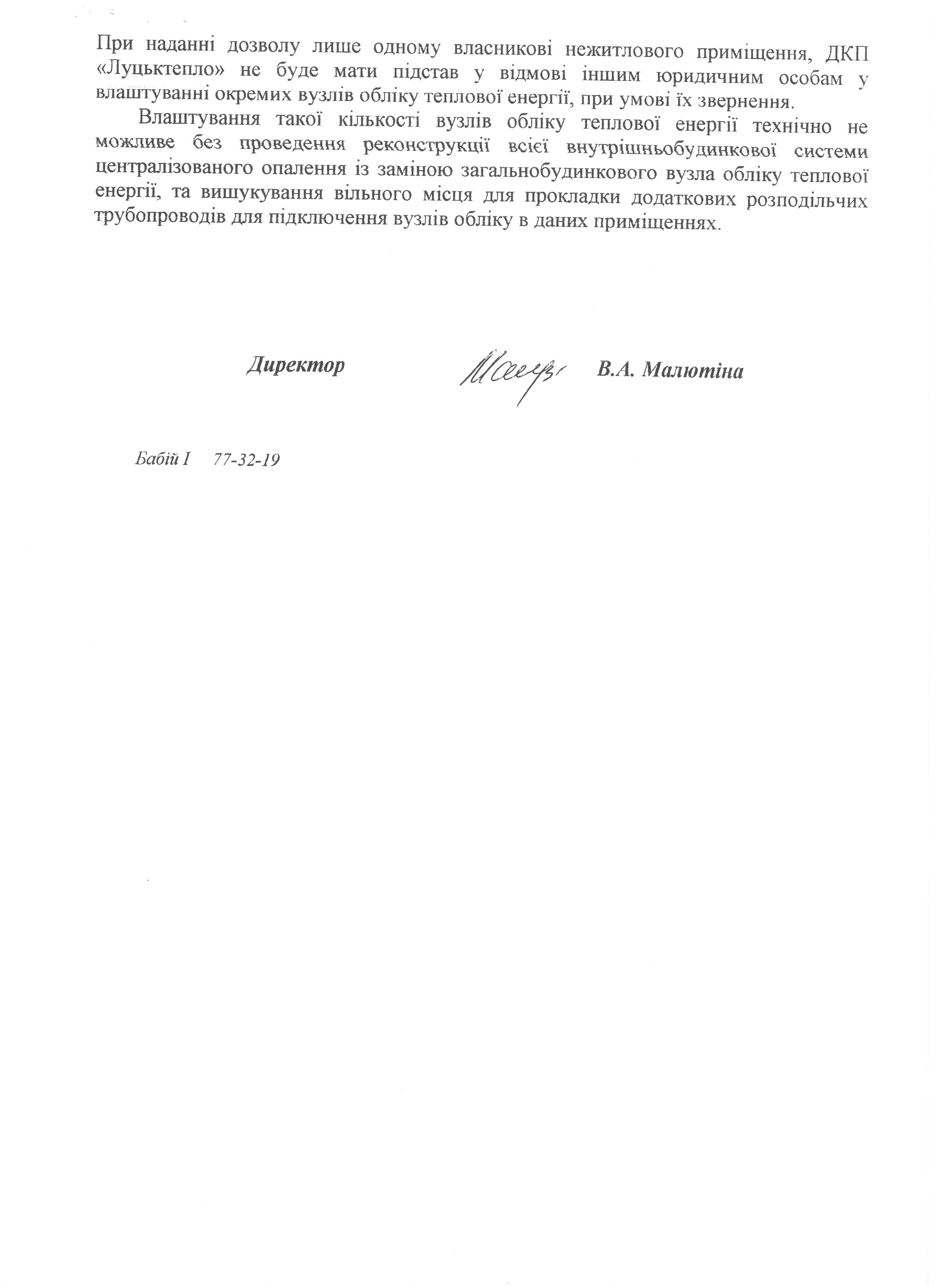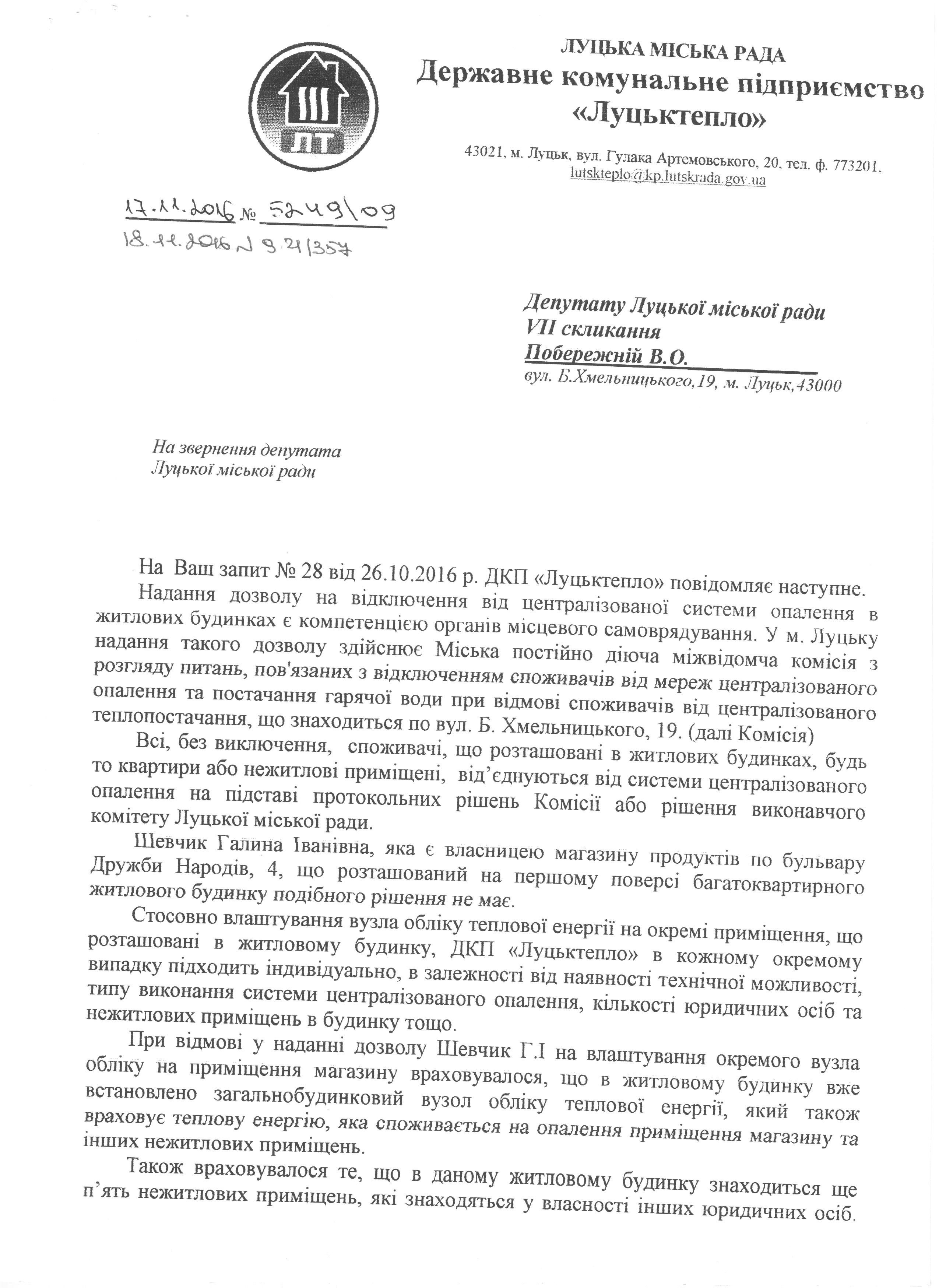 1. Підтримати запит депутата міської ради Побережної В.О. до директора ДКП «Луцьктепло» Малютіної В.А. щодо розгляду звернення власника магазину на бульв. Дружби Народів, 4 (додається).
