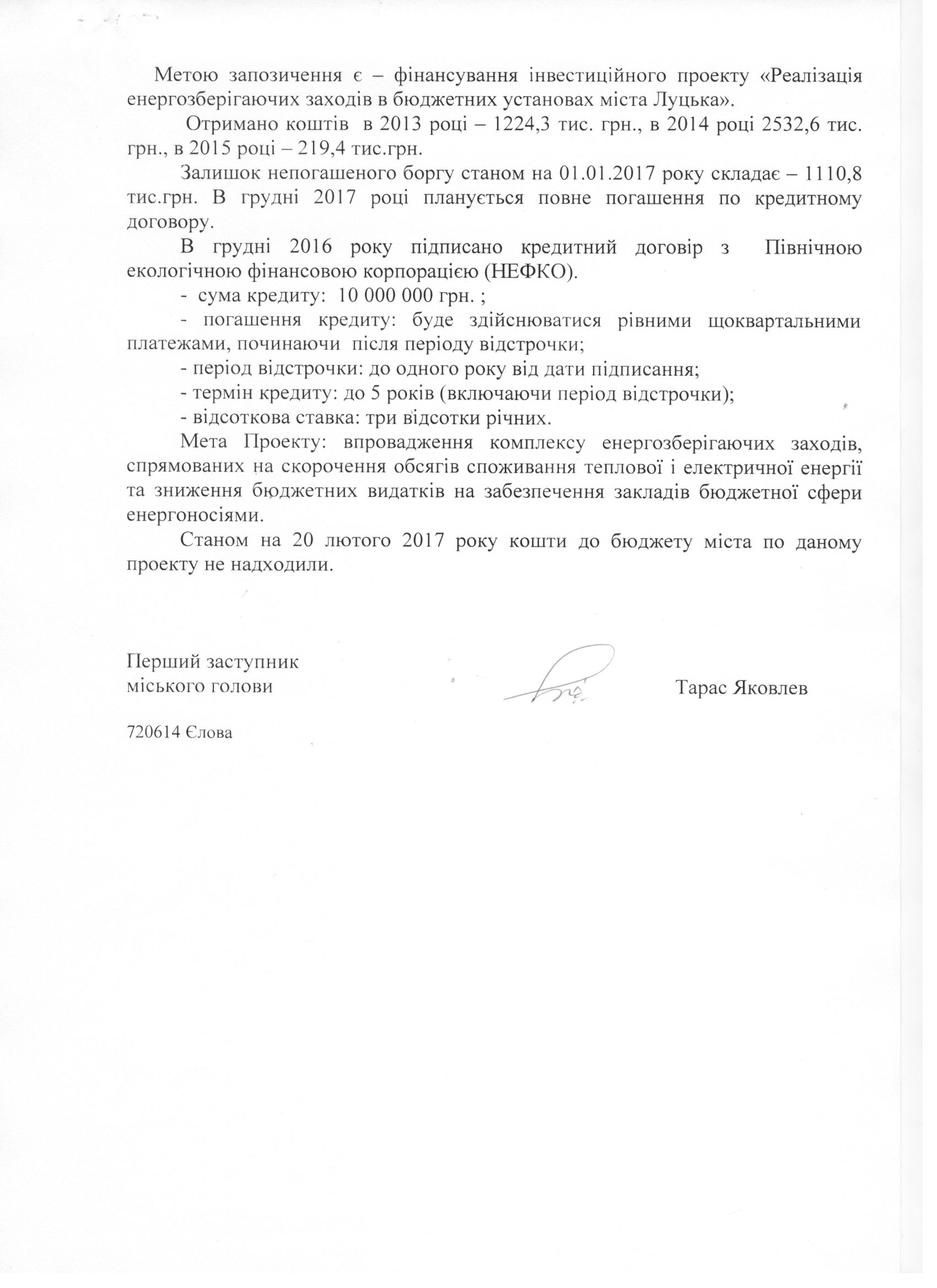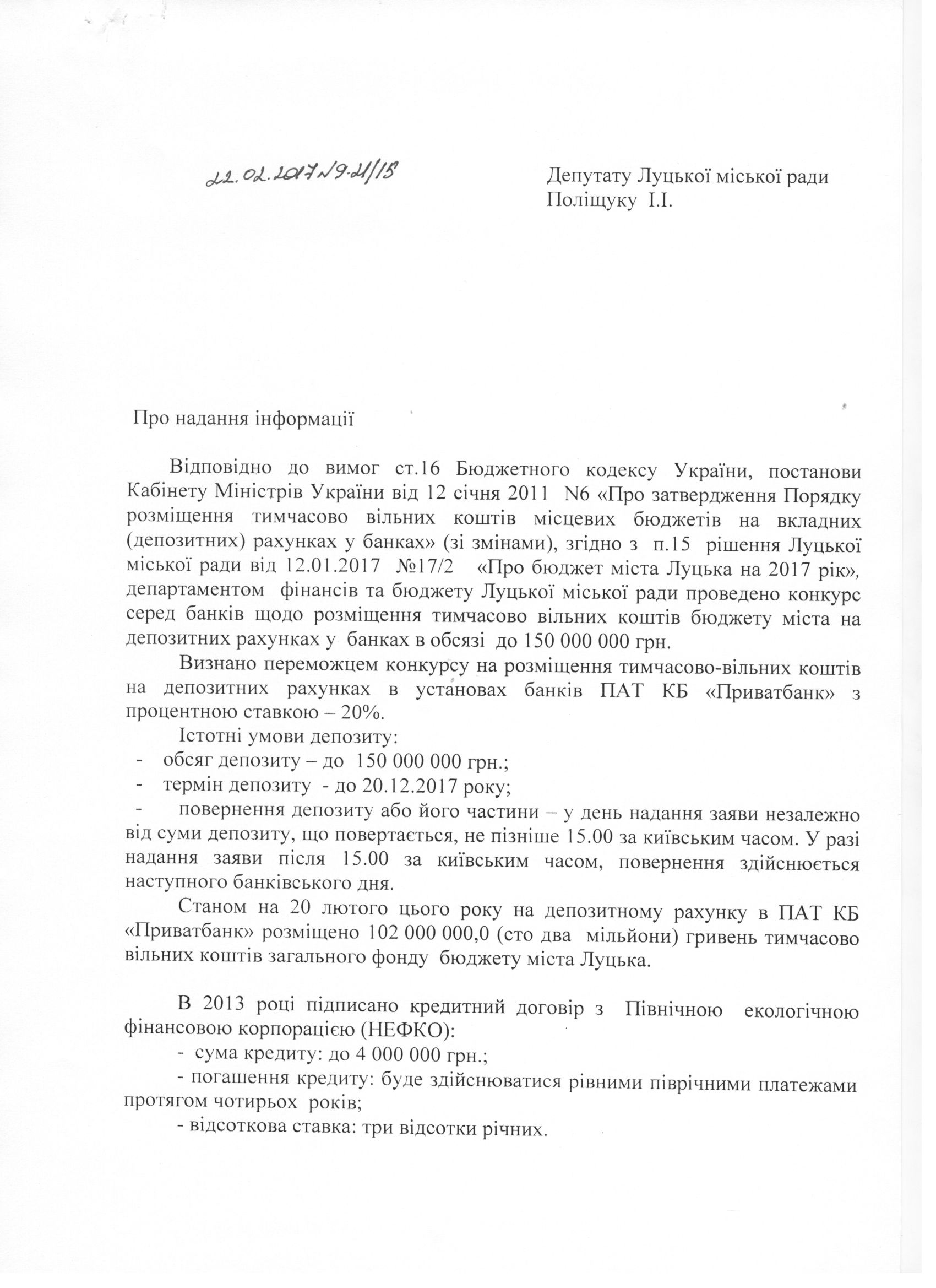 Про запит депутата міської ради Поліщука І.І. щодо надання інформації про депозити та кредитні зобов’язання Луцької міської ради