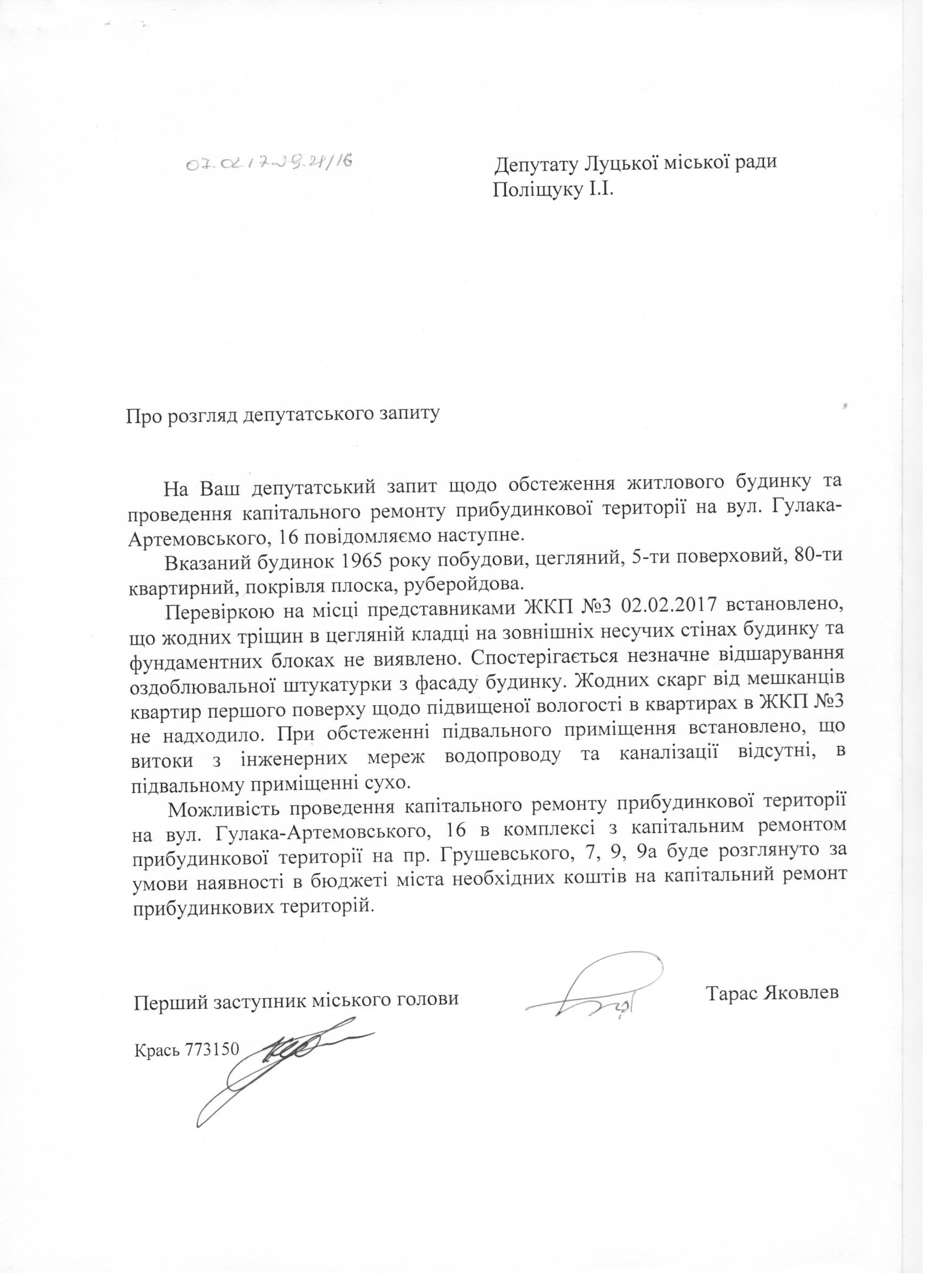 Про запит депутата міської ради Поліщука І.І. щодо проведення обстеження будинку на вул. Гулака-Артемовського, 16 та ремонту прибудинкової території