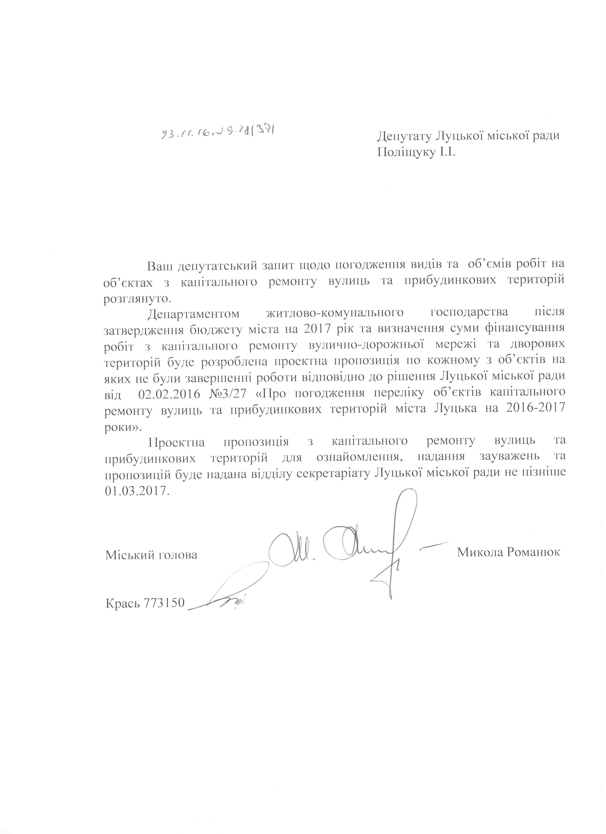 Про запит депутата міської ради Поліщука І.І. щодо вказування під час погодження переліку для ремонту вулиць і прибудинкових територій на наступний рік орієнтовної кошторисної вартості ремонту, а у разі значної кошторисної вартості
