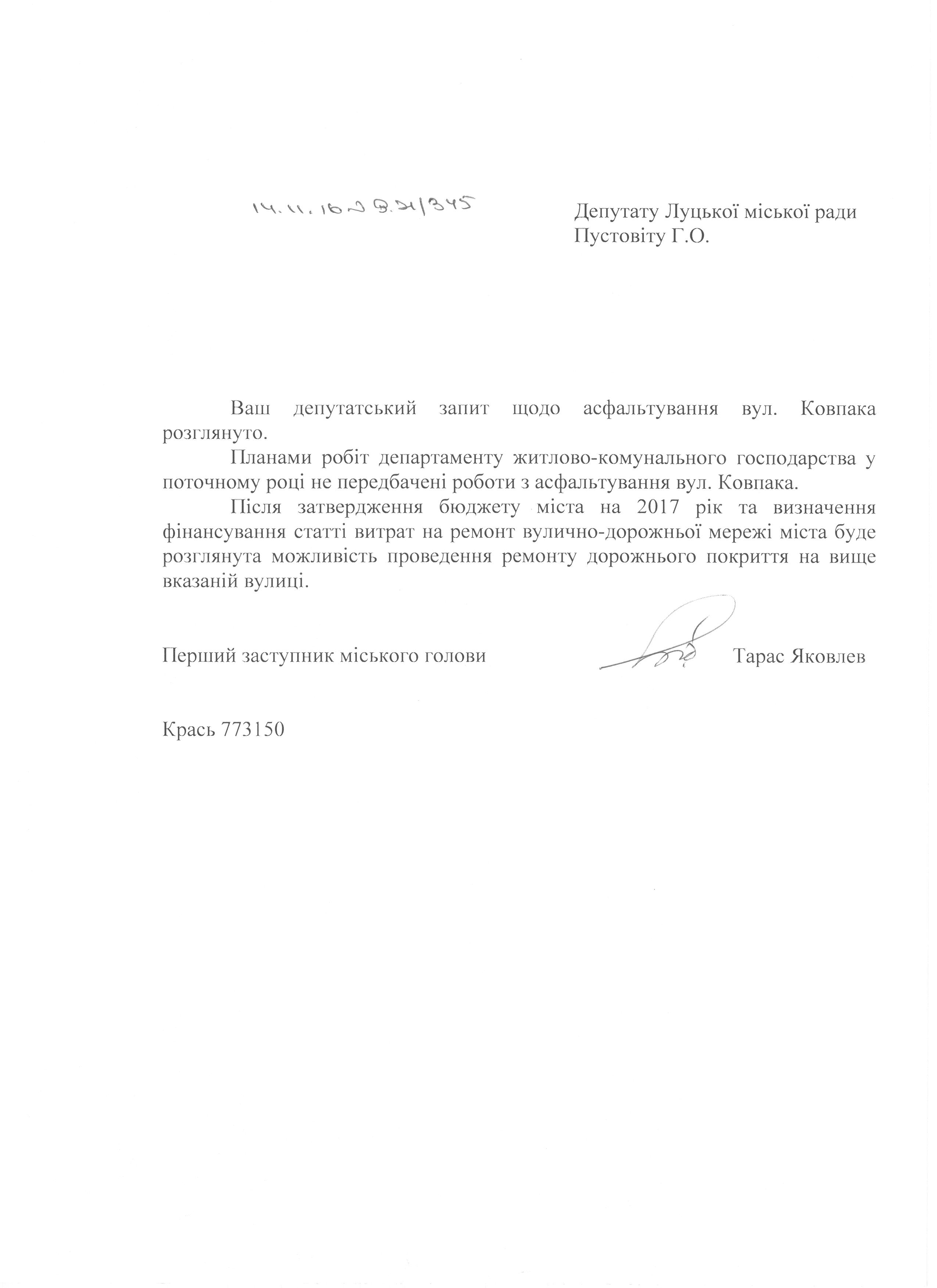 1. Підтримати запит депутата міської ради Пустовіта Г.О. до міського голови Романюка М.Я. щодо ремонту вулиці Ковпака (додається).