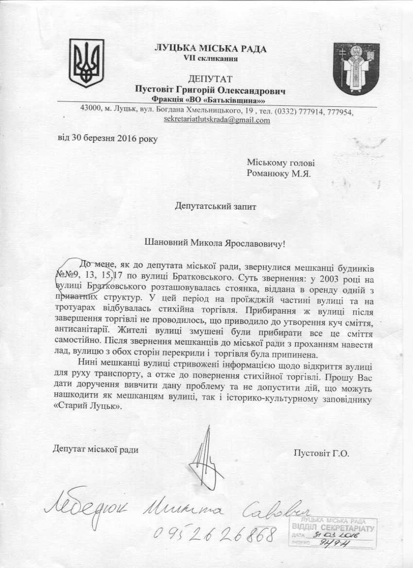 1. Підтримати запит депутата міської ради Пустовіта Г.О. до міського голови Романюка М.Я. щодо стихійної торгівлі на вул. Братковського (додається).