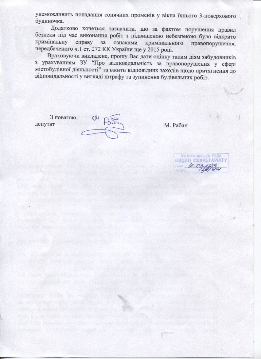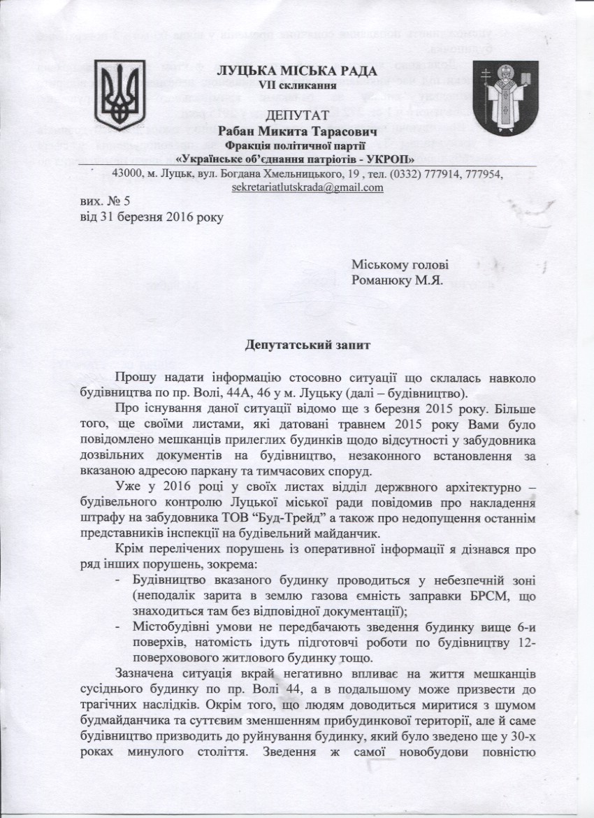 Про запит депутата міської ради Рабана М.Т. про надання інформації щодо будівництва на пр.Волі, 44А, 46