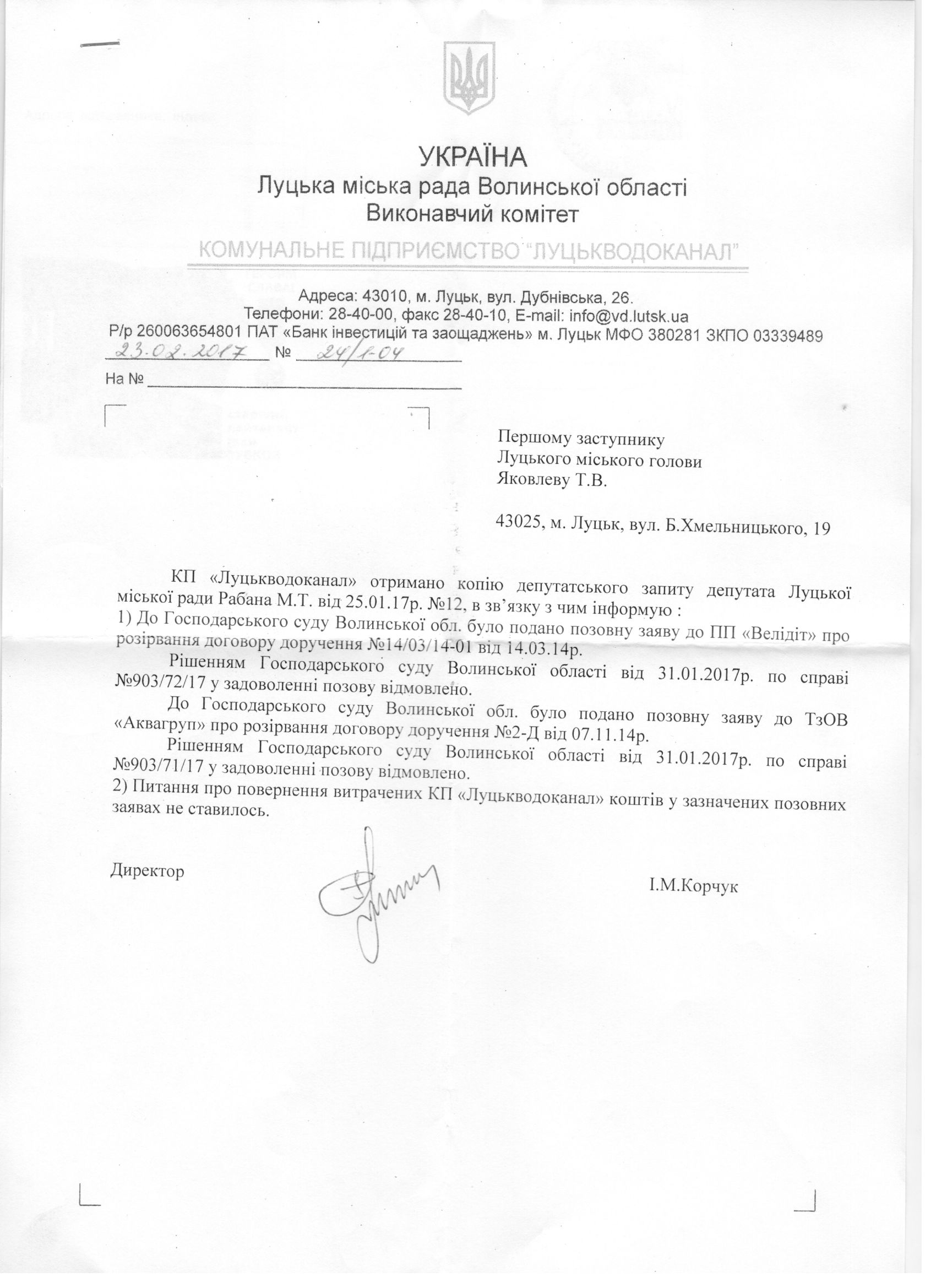 Про запит депутата міської ради Рабана М.Т. щодо надання інформації про предмет та підстави позовів КП «Луцькводоканал» щодо розірвання договорів з юридичними особами у Господарськиму суді Волинської області