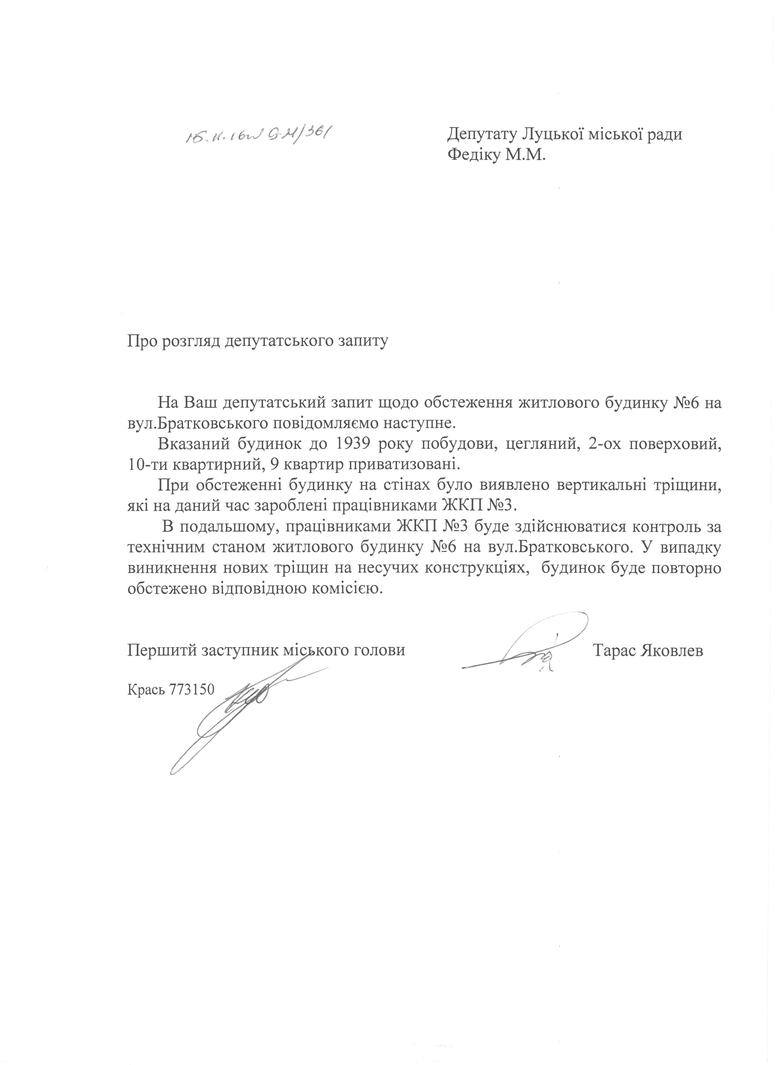 1. Підтримати запит депутата міської ради Романюка М.П. до міського голови Романюка М.Я. щодо перевірки стану будинку на вул. Братковського, 6 (додається).