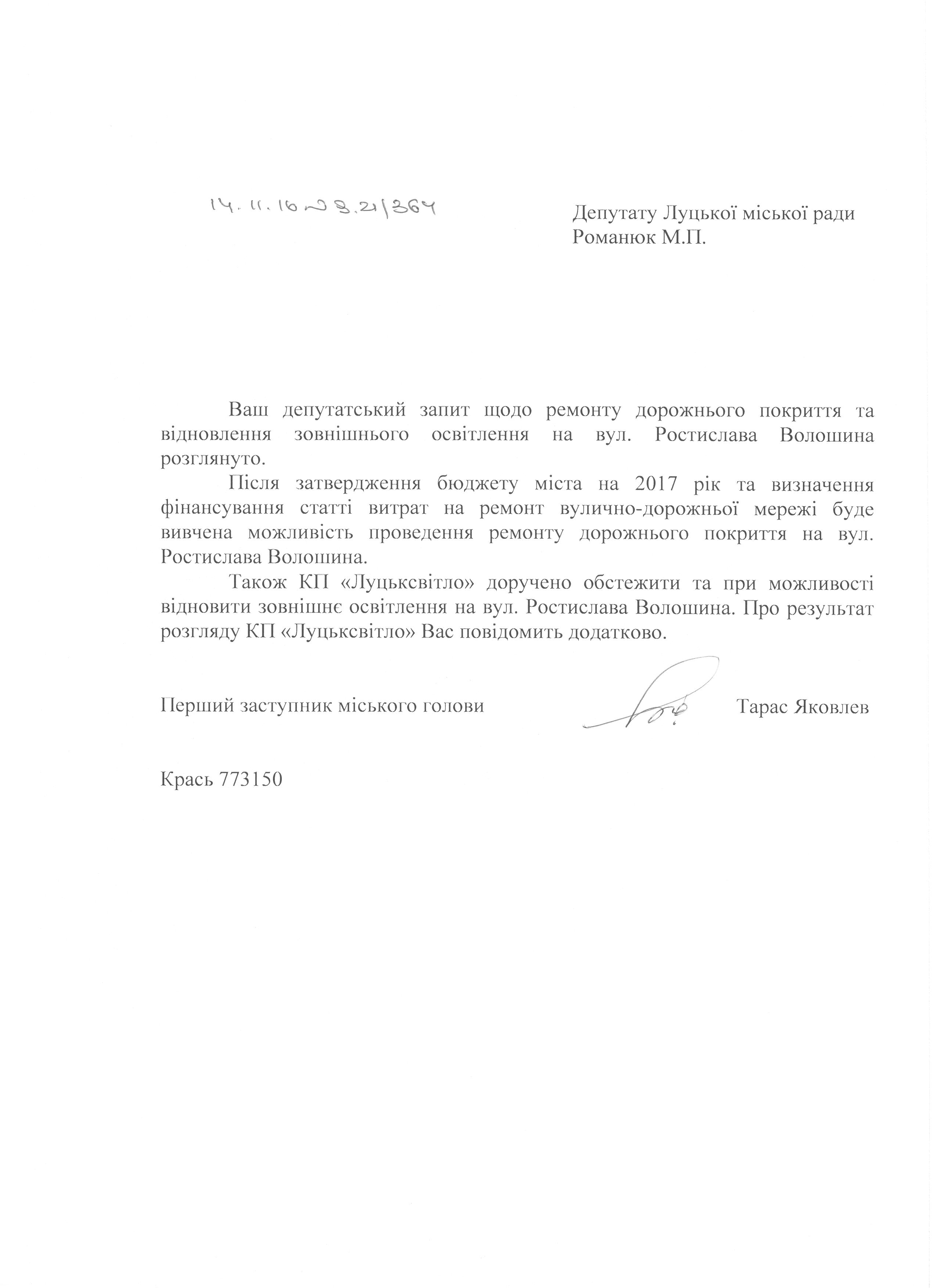 Про запит депутата міської ради Романюка М.П. щодо ремонту вулиці Ростислава Волошина