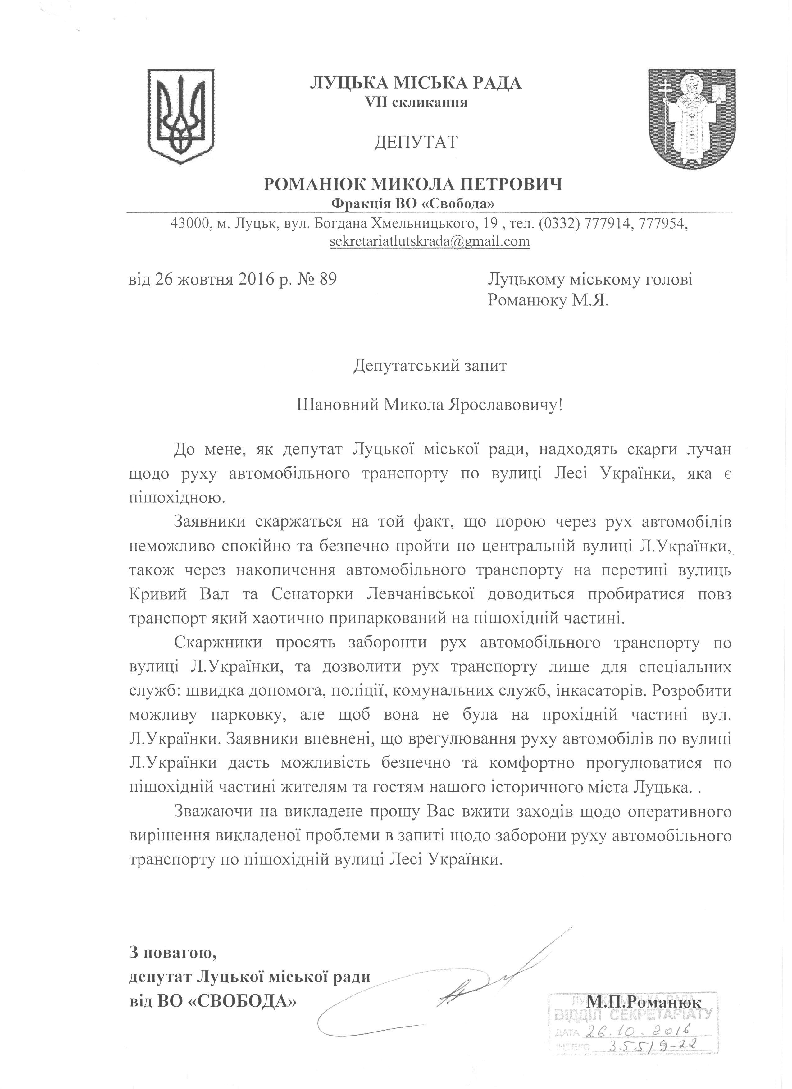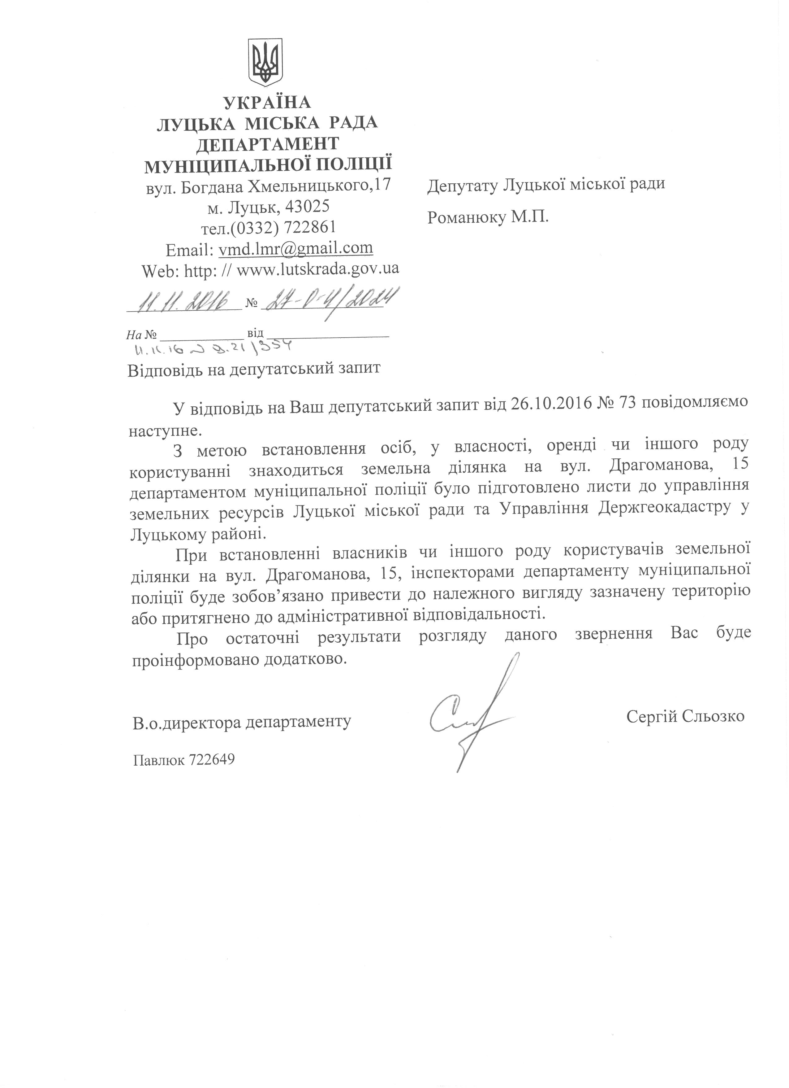 1. Підтримати запит депутата міської ради Романюка М.П. до директора департаменту муніципальної поліції Сиротинської Ю.Я. щодо забезпечення благоустрою території на вул. Драгоманова, 19 (додається).
