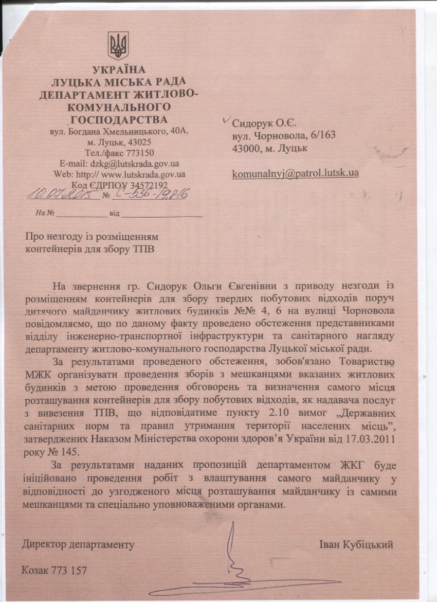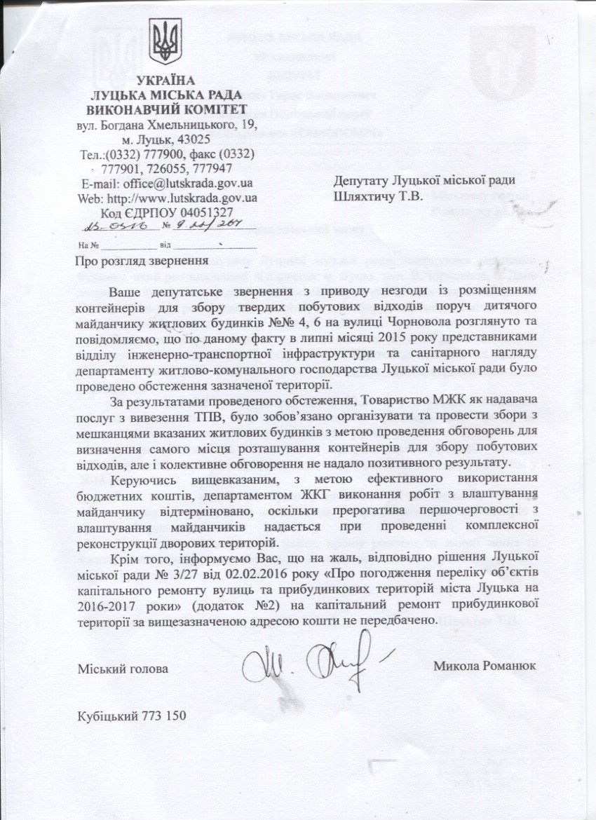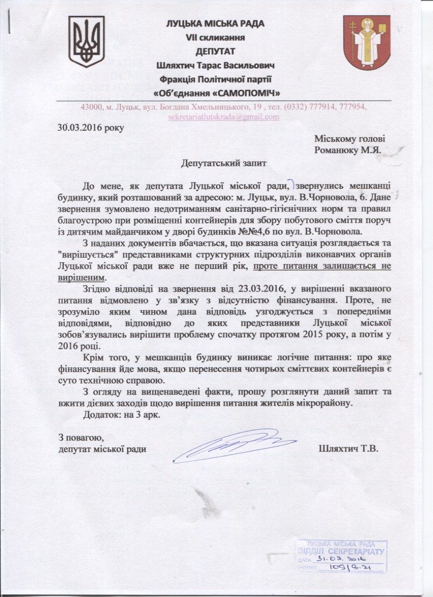 1. Підтримати запит депутата міської ради Шляхтича Т.В. до міського голови Романюка М.Я. щодо недотримання санітарно-гігієнічних норм та правил благоустрою при розміщенні контейнерів для збору побутових відходів поруч дитячого майданчику житлових будинків №№ 4, 6 на вул.Чорновола (додається).