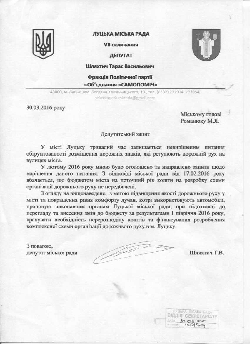 1. Підтримати запит депутата міської ради Шляхтича Т.В. до міського голови Романюка М.Я. щодо розроблення комплексної схеми організації дорожнього руху в місті Луцьку (додається).