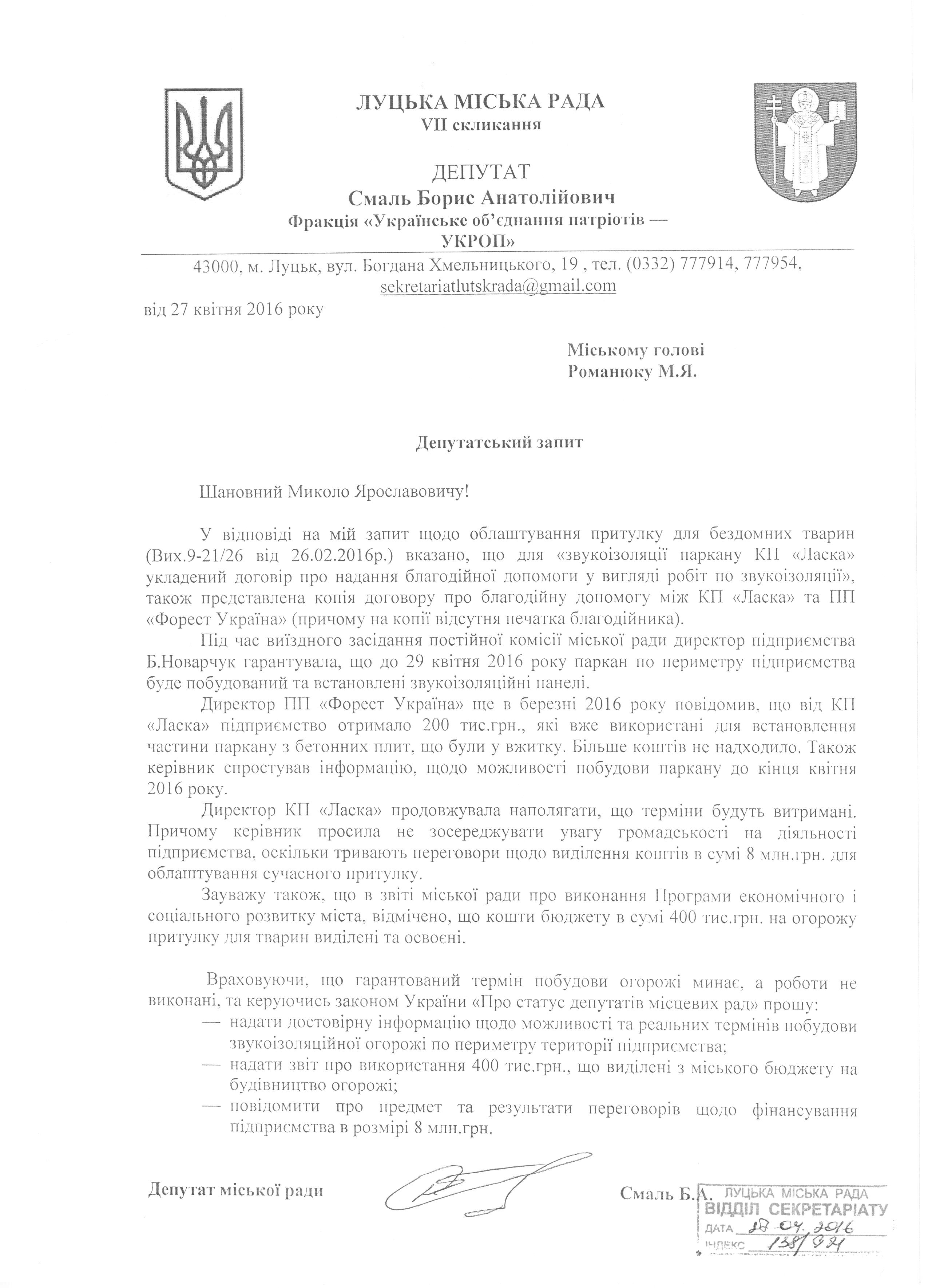 1. Підтримати запит депутата міської ради Смаля Б.А. до міського голови Романюка М.Я. про надання інформації щодо побудови звукоізолюючої огорожі по периметру території КП «Ласка» (додається).