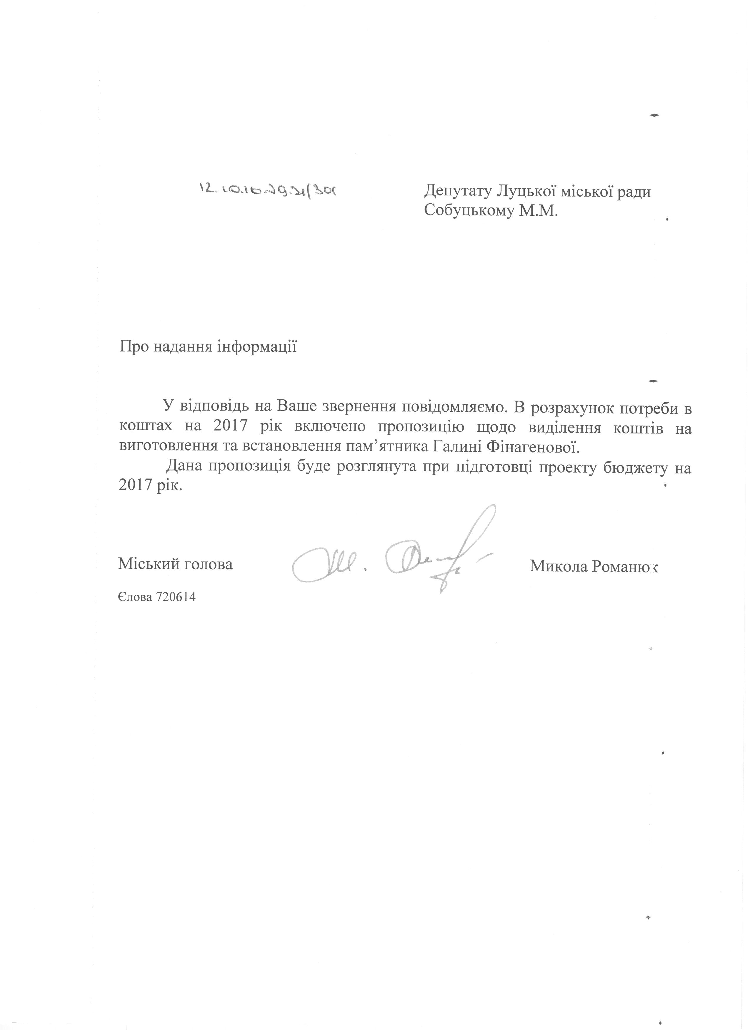 1. Підтримати запит депутата міської ради Собуцького М.М. до міського голови Романюка М.Я. щодо виділення коштів для спорудження пам’ятника на могилі Галини Фінагенової (додається).