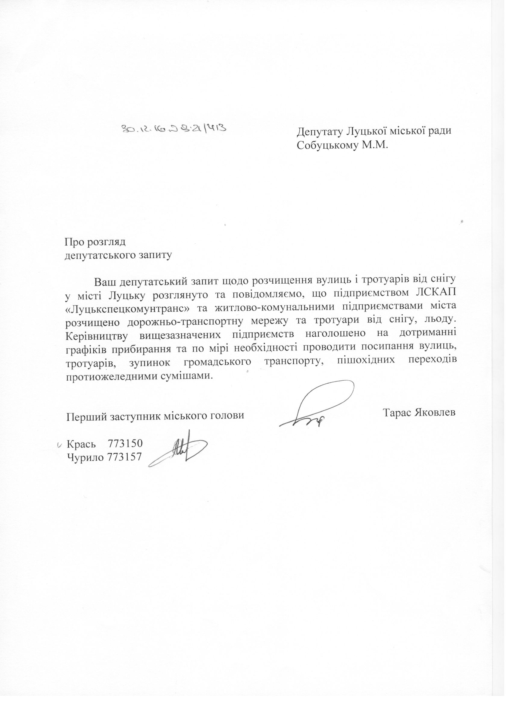 Про запит депутата міської ради Собуцький М.М. щодо забезпечення належного утримання доріг та тротуарів в зимовий період