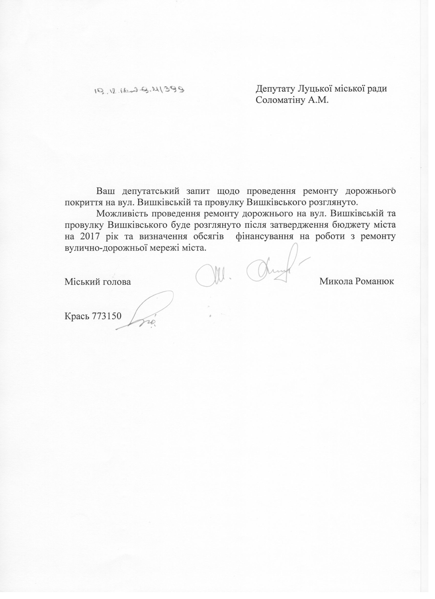 1. Підтримати запит депутата міської ради Соломатіна А.М. до міського голови Романюка М.Я. щодо ремонту дорожнього покриття вул. Вишківської (додається).