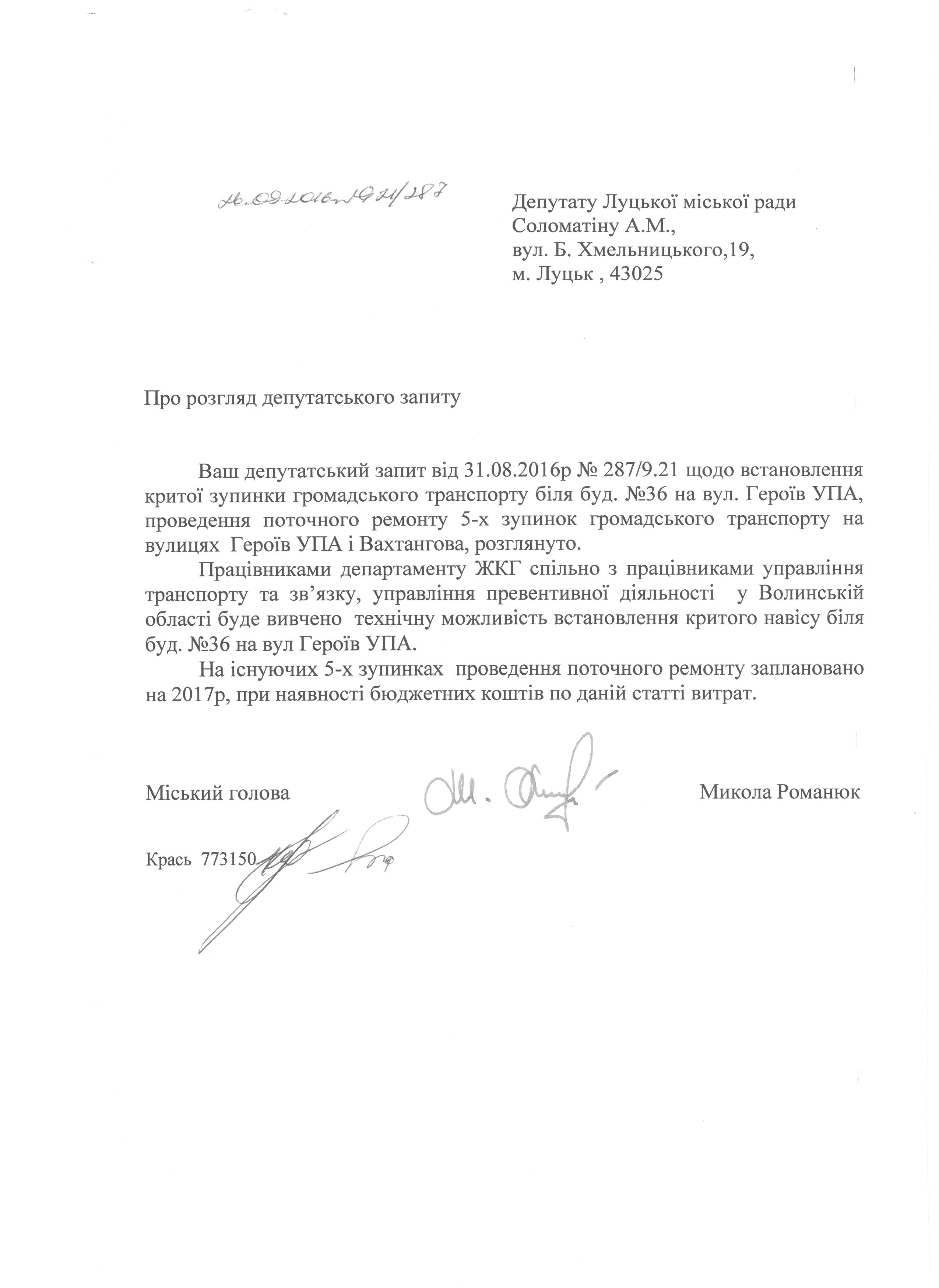 1. Підтримати запит депутата міської ради Соломатіна А.М. до міського голови Романюка М.Я. щодо встановлення критої зупинки громадського транспорту на вул. Героїв УПА, біля ЗОШ № 12 (додається).
