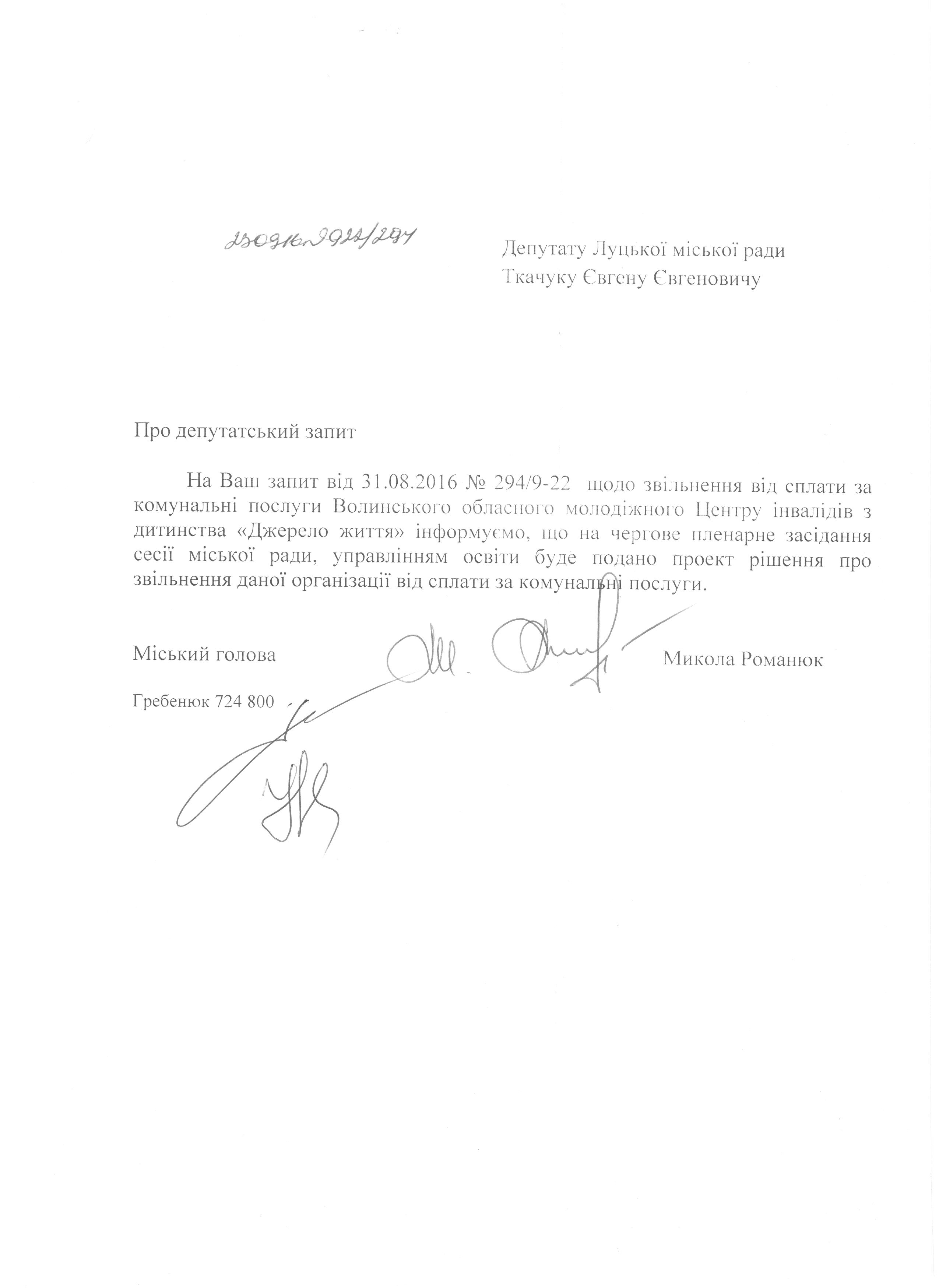 1. Підтримати запит депутата міської ради Ткачука Є.Є. до міського голови Романюка М.Я. щодо сплати комунальних послуг Волинського обласного молодіжного Центру реабілітації інвалідів з дитинства «Джерело життя» (додається).