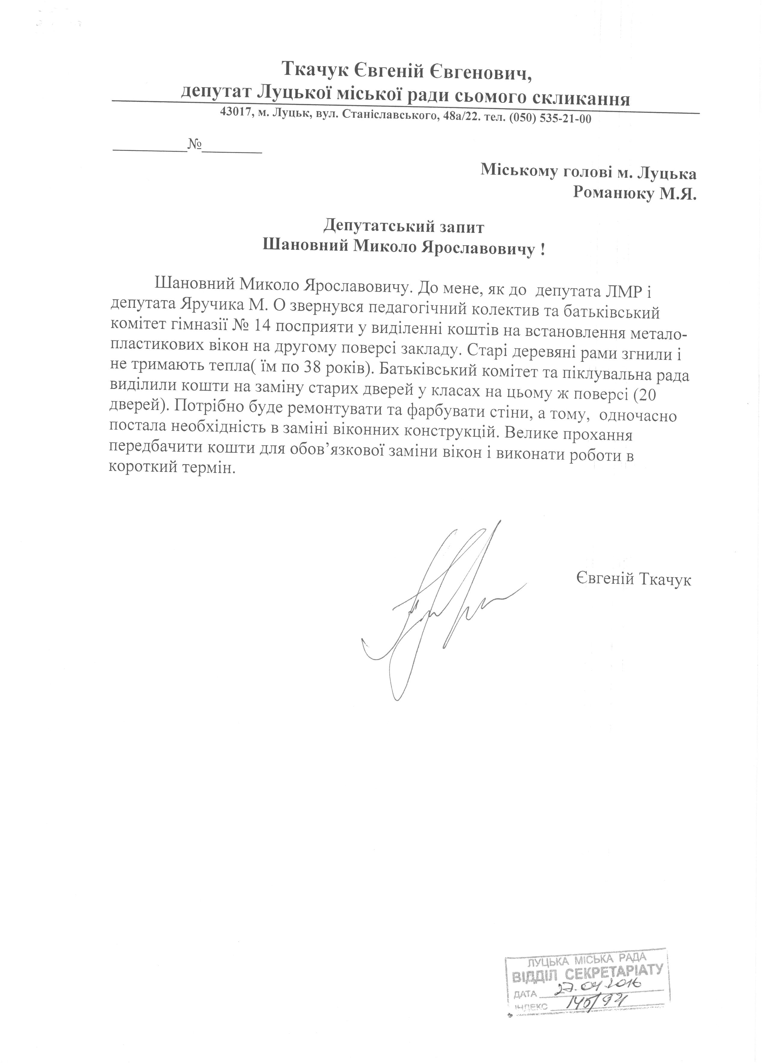 1. Підтримати запит депутата міської ради Ткачука Є.Є. до міського голови Романюка М.Я. щодо заміни вікон в гімназії № 14 (додається).