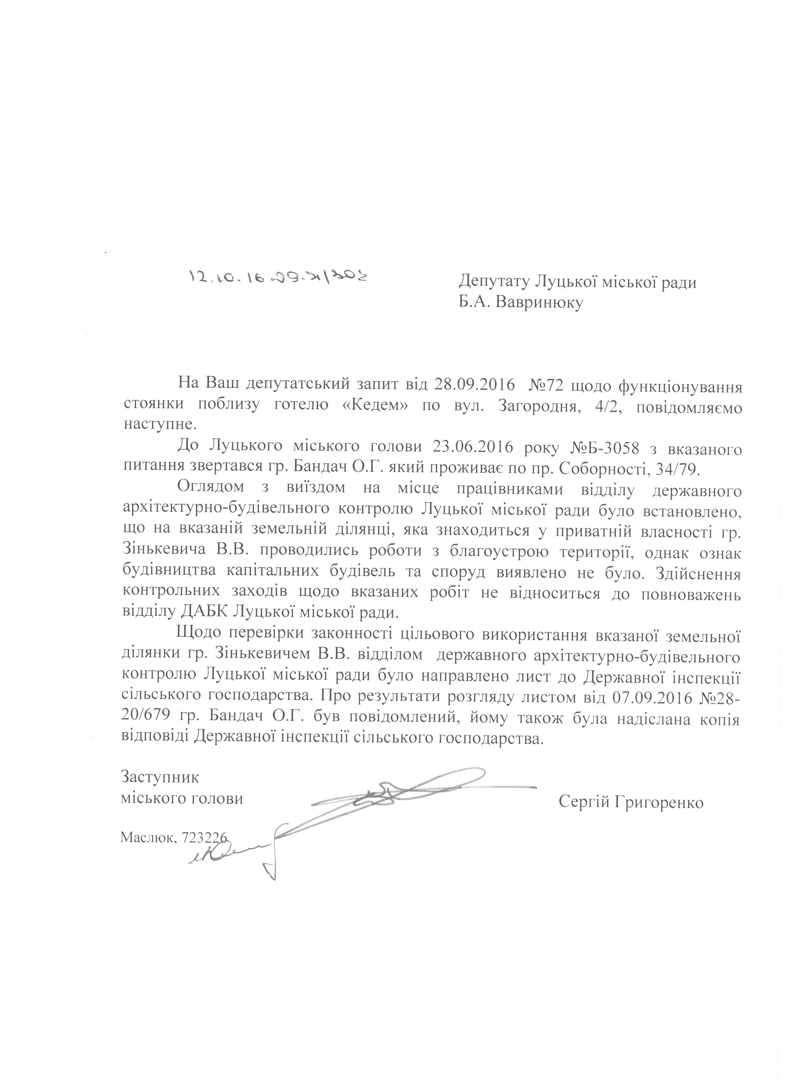 1. Підтримати запит депутата міської ради Вавринюка Б.А. до міського голови Романюка М.Я. щодо перевірки законності використання земельної ділянки на вул. Загородній, 4/2 (додається).