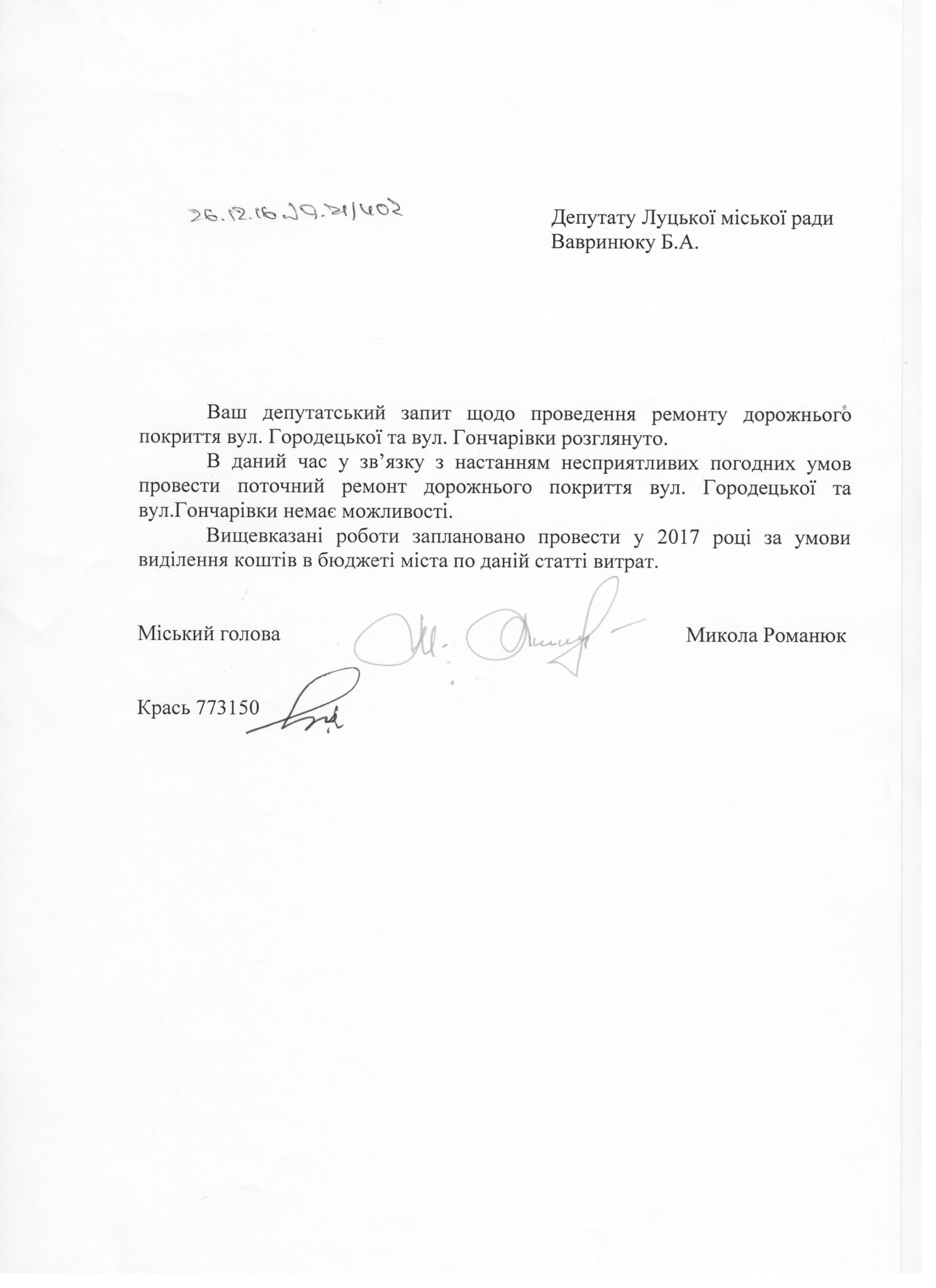 Про запит депутата міської ради Вавринюка Б.А. щодо поточного ремонту вулиць Городецька та Гончарівка