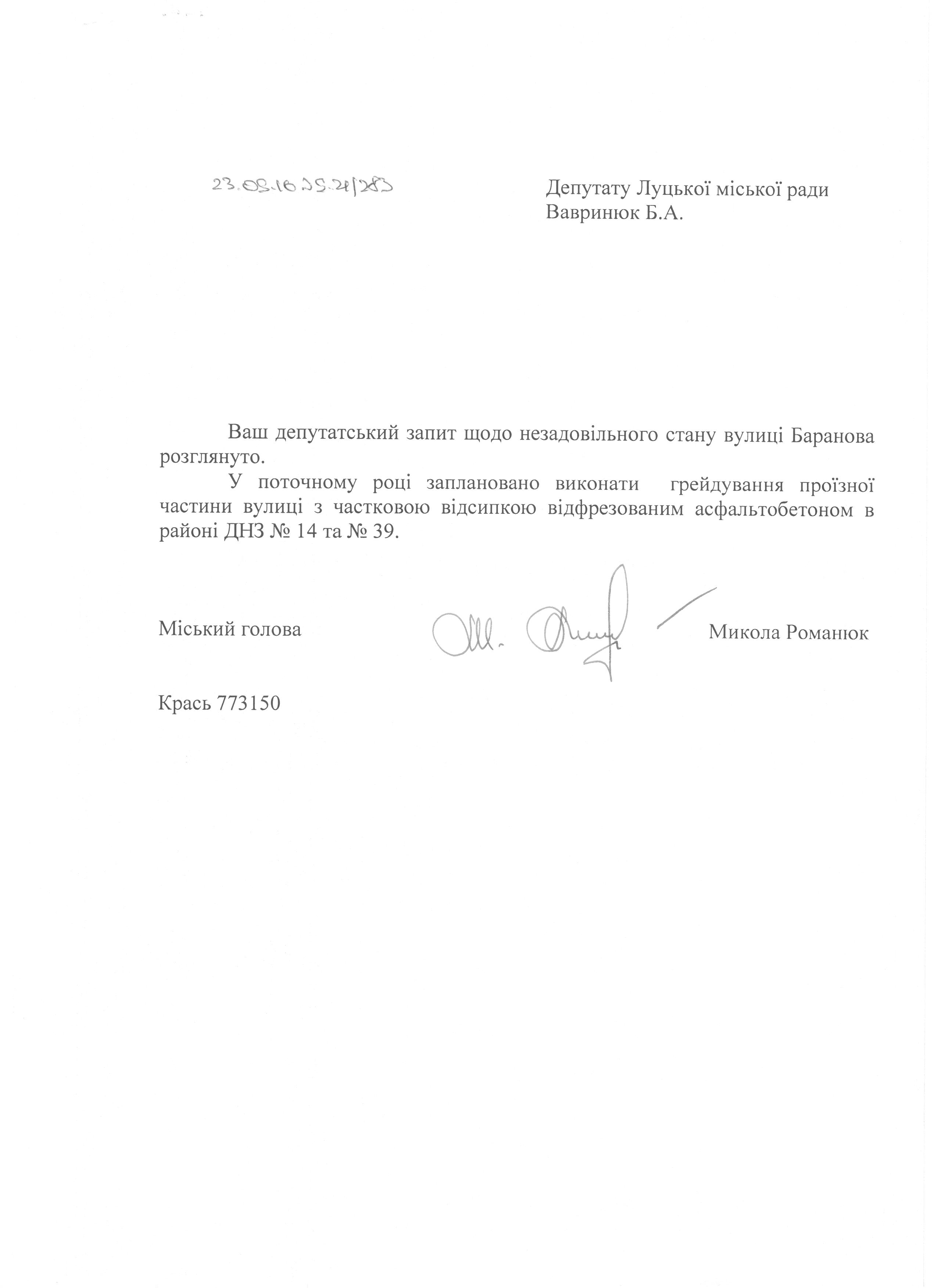 1. Підтримати запит депутата міської ради Вавринюка Б.А. до міського голови Романюка М.Я. щодо проведення поточного ремонту вул. Баранова (додається).