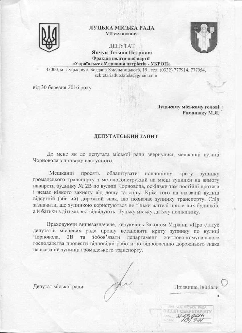1. Підтримати запит депутата міської ради Янчук Т.П. до міського голови Романюка М.Я. щодо встановлення критої зупинки громадського транспорту на вул.В'ячеслава Чорновола (додається).