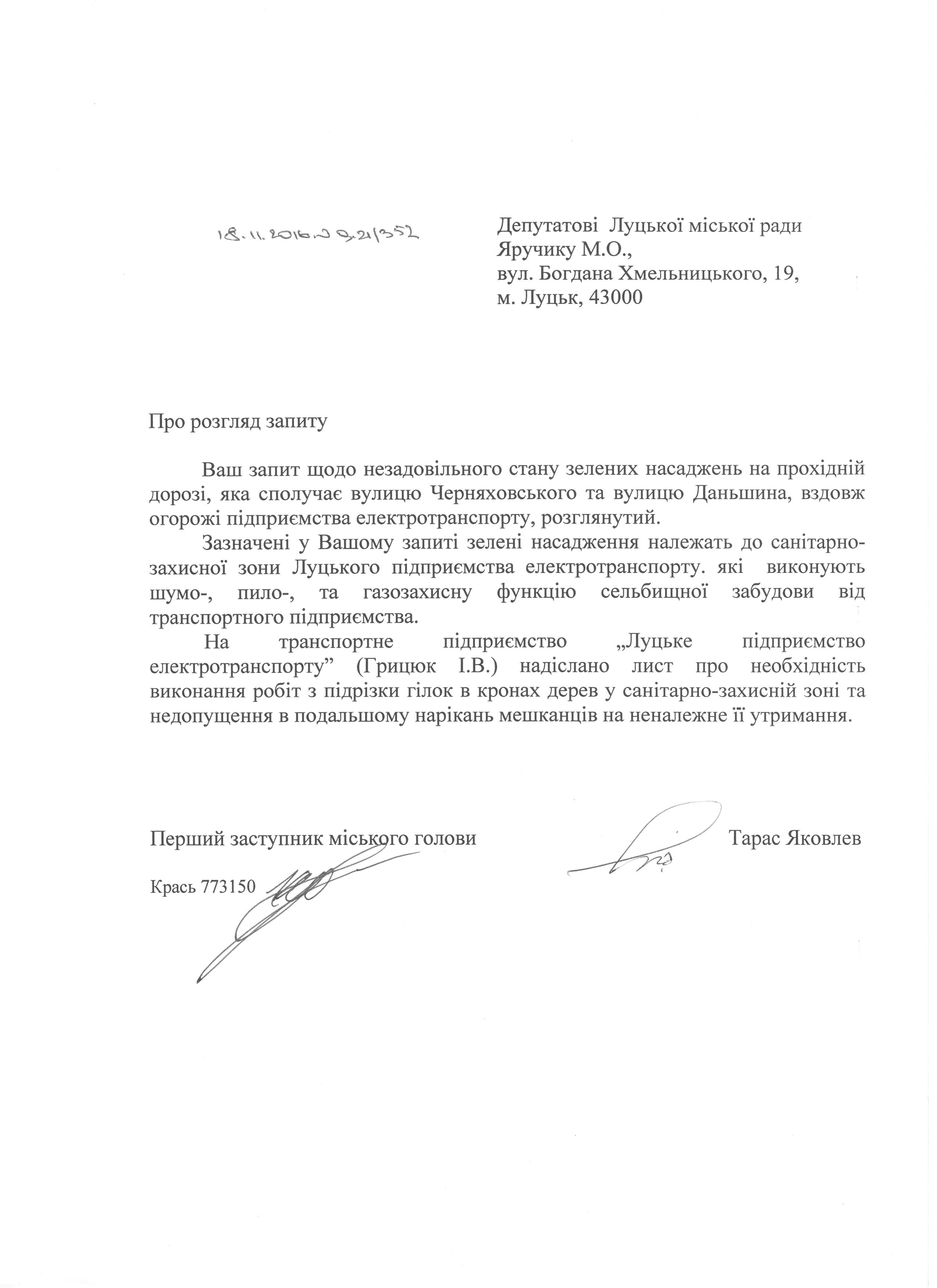 1. Підтримати запит депутата міської ради Яручика М.О. до міського голови Романюка М.Я. щодо кронування дерев між вул. Даньшина та Черняховського (додається).