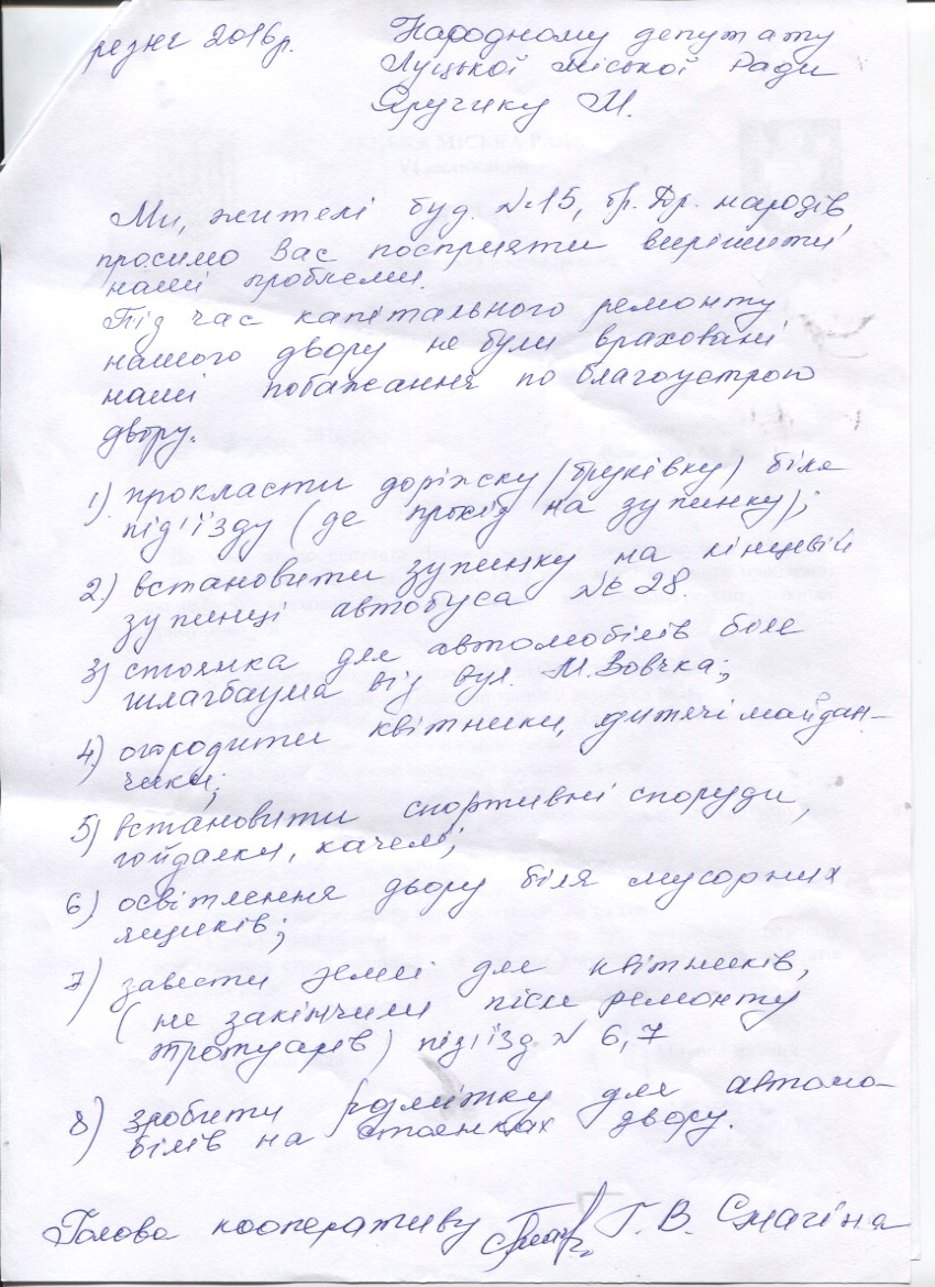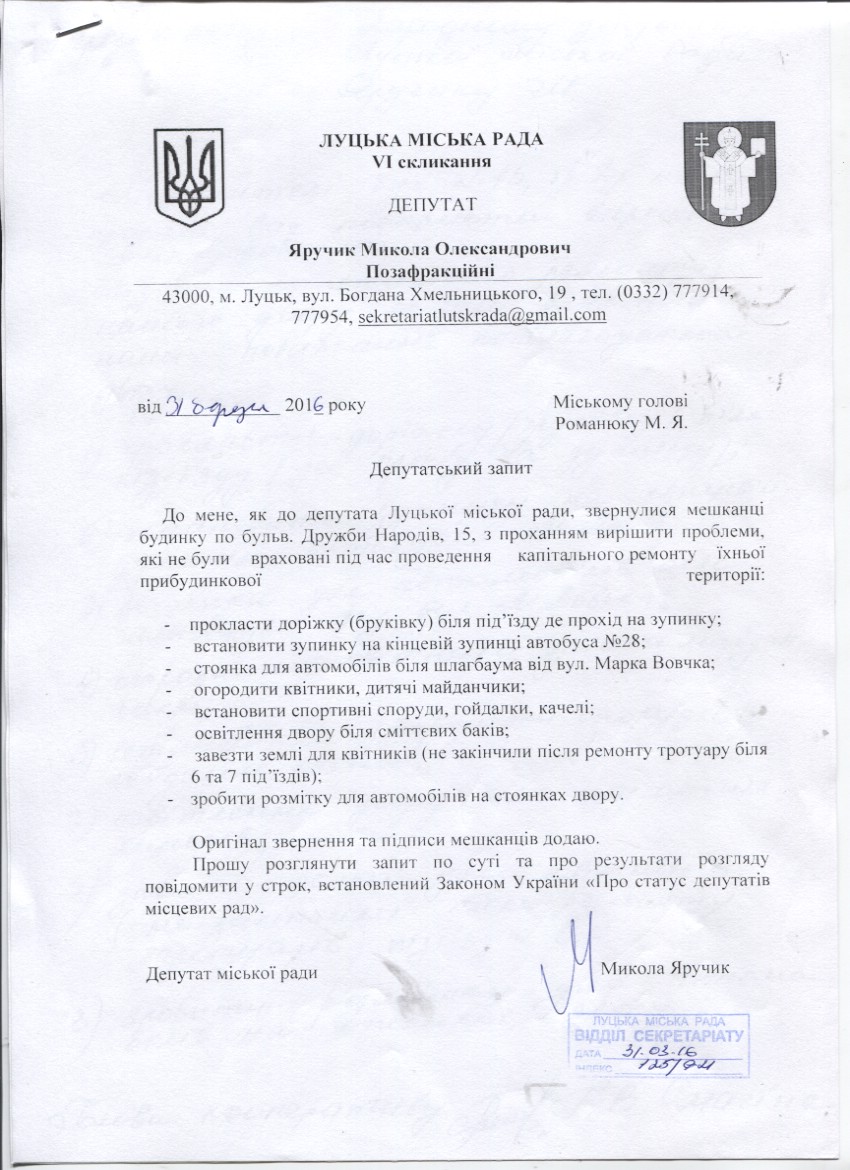1. Підтримати запит депутата міської ради Яручика М.О. до міського голови Романюка М.Я. щодо ремонту прибудинкової території на бульварі Дружби Народів, 15 (додається).