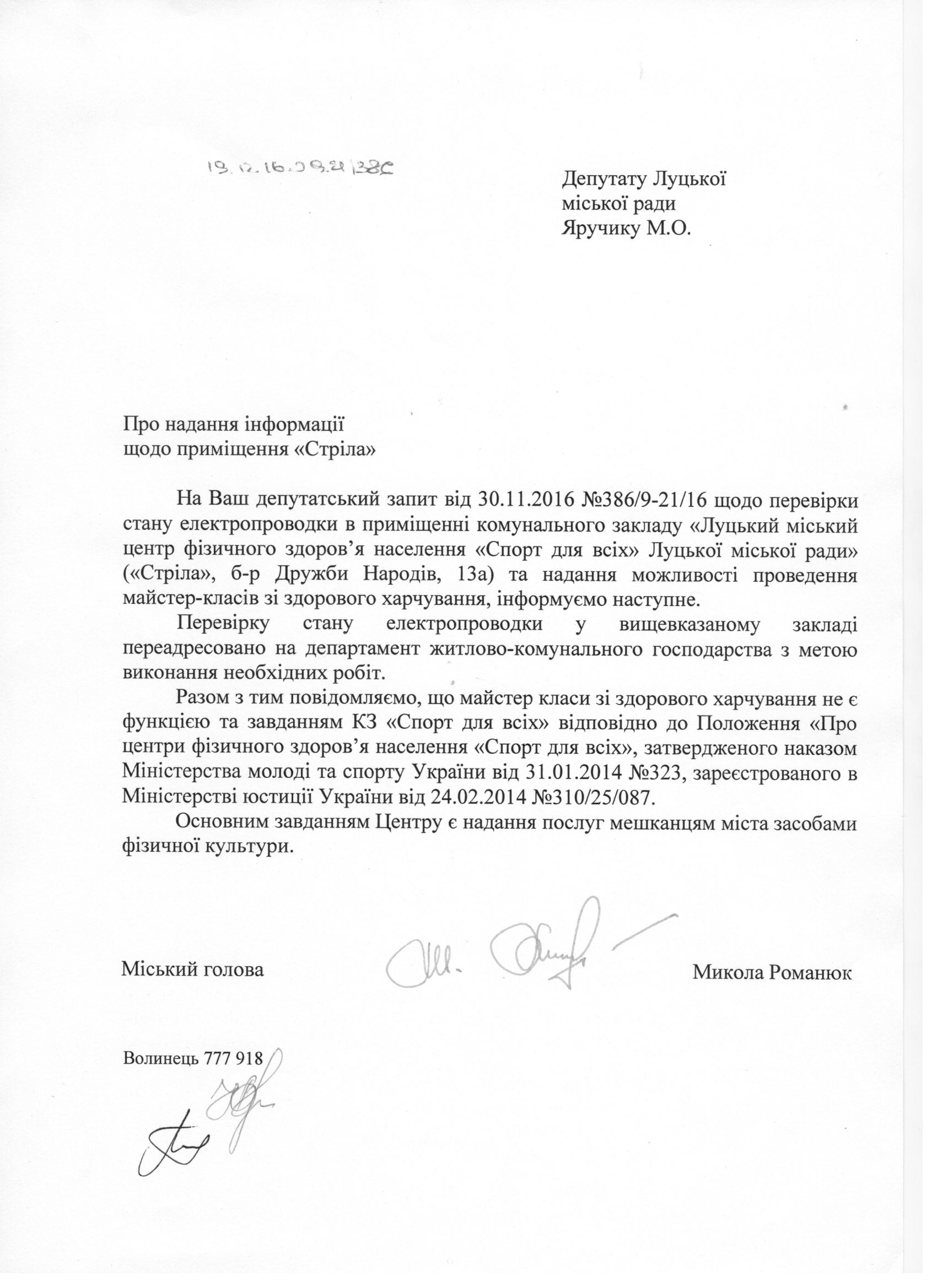 Про запит депутата міської ради Яручика М.О. щодо розгляду звернення ініціативної групи району ЛПЗ