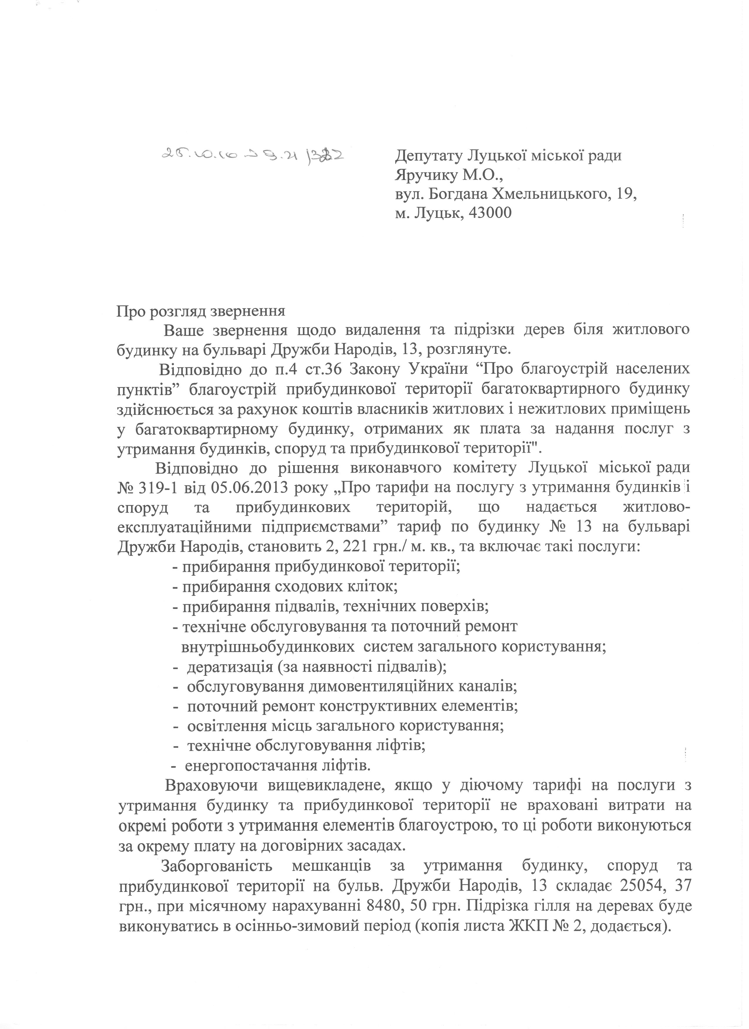 Про запит депутата міської ради Яручика М.О. щодо зрізання старих та кронування великих дерев на бульв. Дружби Народів, 13
