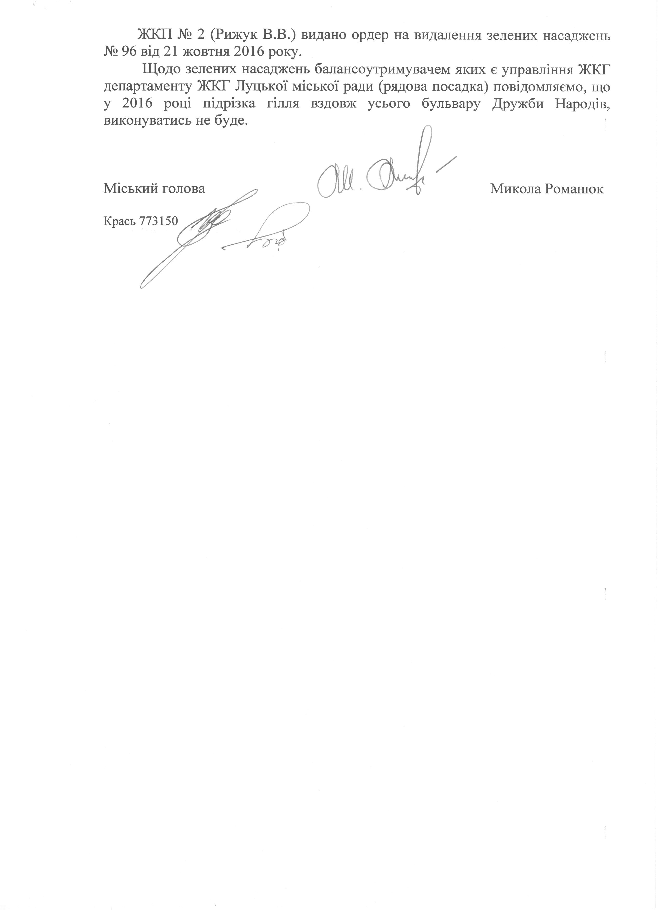 1. Підтримати запит депутата міської ради Яручика М.О. до міського голови Романюка М.Я. щодо зрізання старих та кронування великих дерев на бульв. Дружби Народів, 13 (додається).